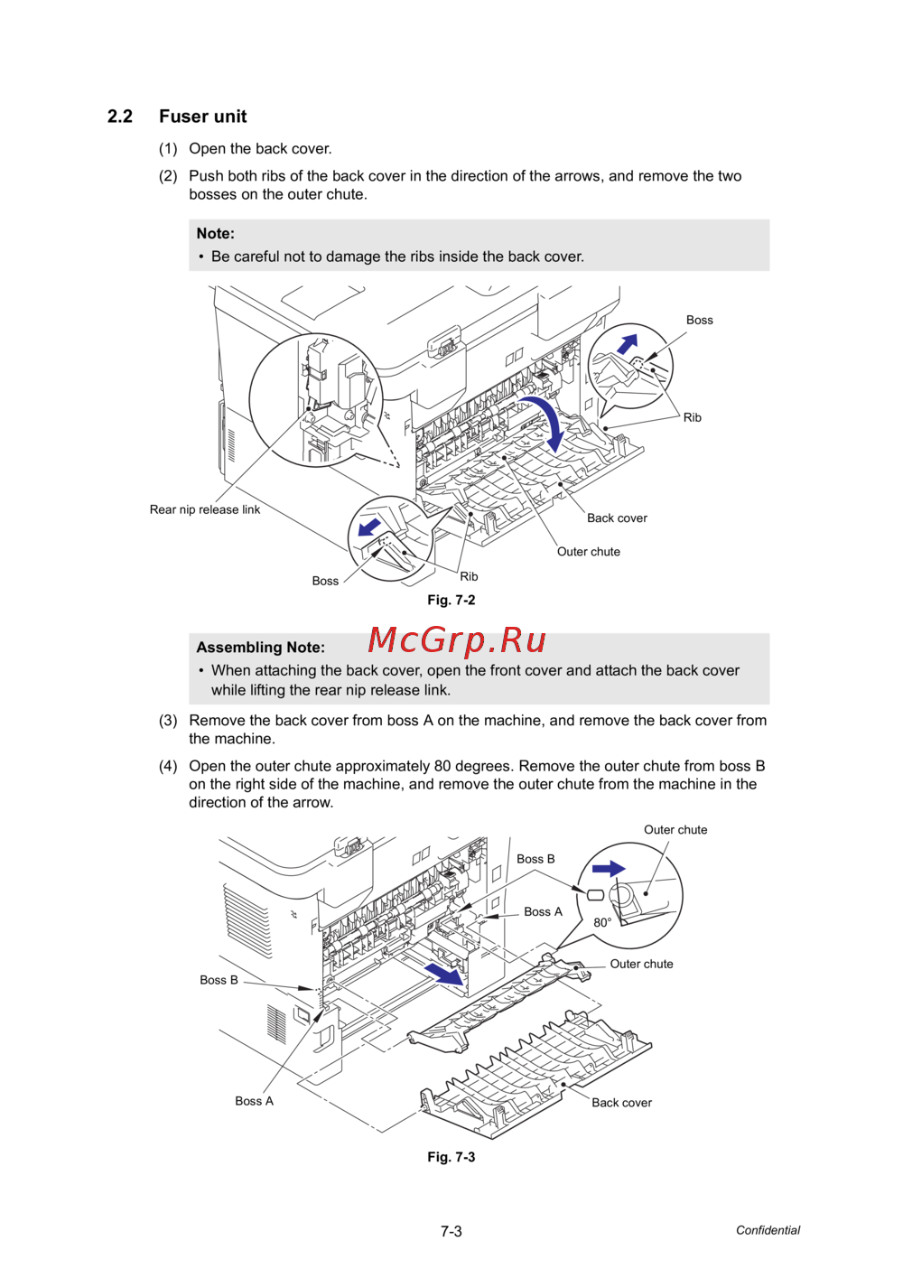 - 2 push both ribs of the back cover in the direction of the arrows and remove the two bosses on the outer chute p.353
