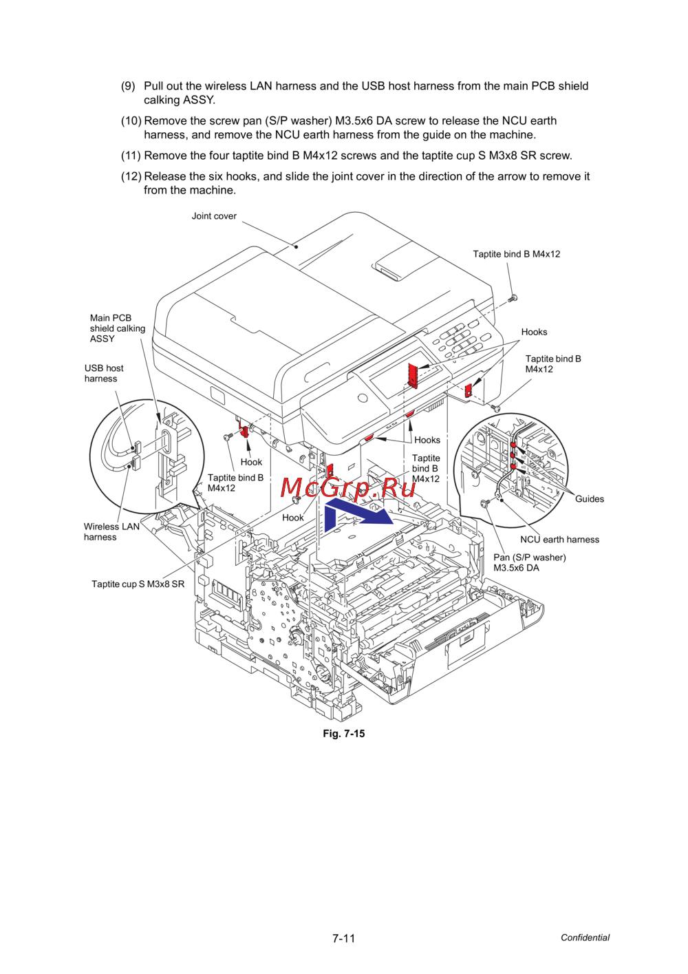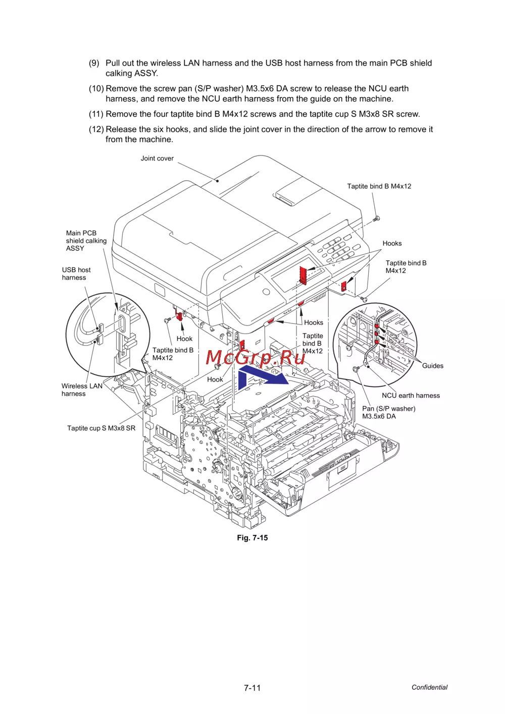 - 8 disconnect the second side cis flat cable duplex scanning models only first side cis flat cable adf cover document detection sensor harness second side document scanning position sensor harness adf motor harness document scanner motor harness panel pcb harness wireless lan harness models with wireless lan only usb host harness speaker harness models with speaker only and ncu harness models with ncu only from the main pcb assy and release these harnesses from the securing fixtures p.360