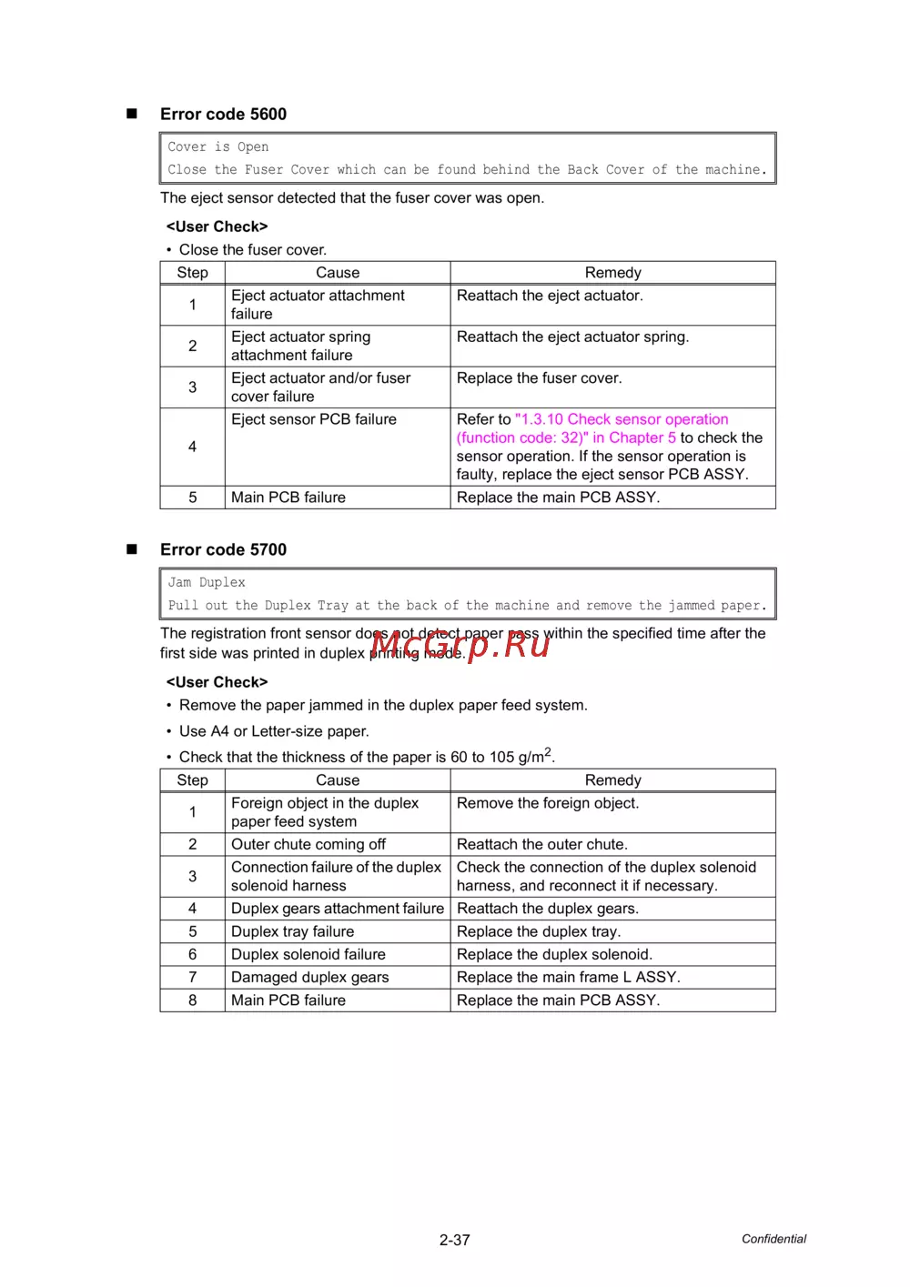 5 Duplex tray failure Replace the duplex tray.