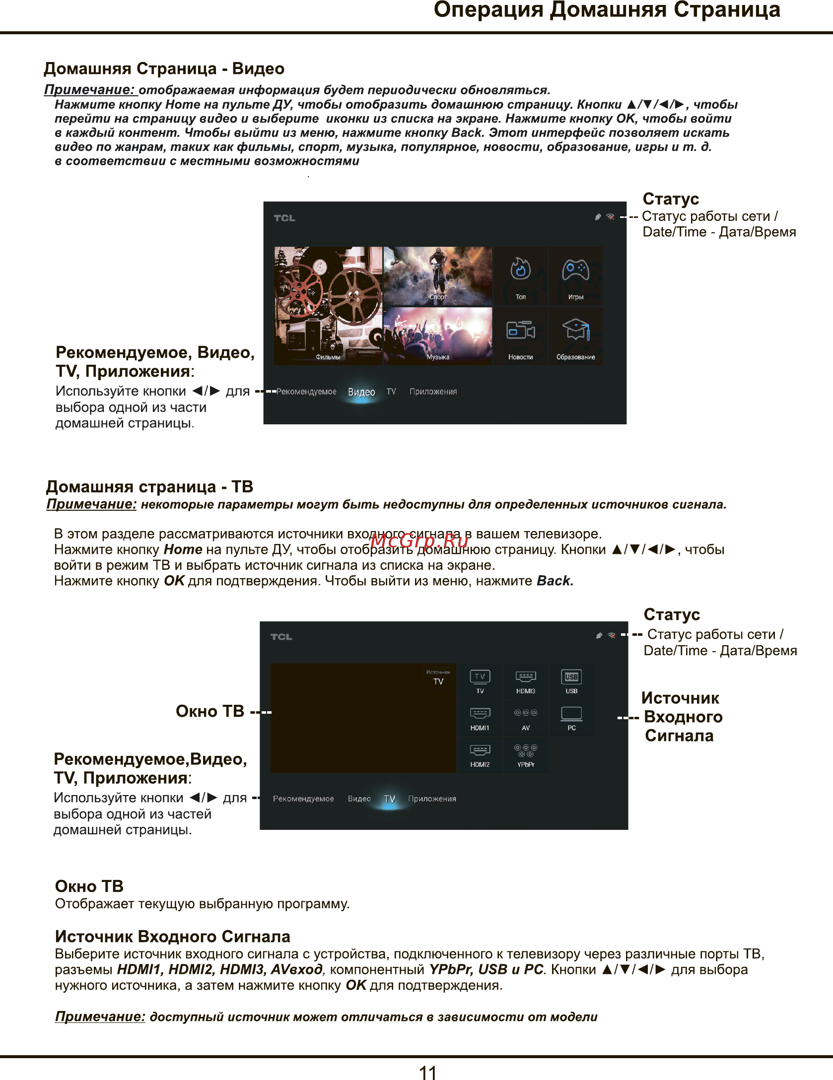 Операция Домашняя Страница Домашняя Страница Видео Примечание отображаемая информация будет периодически обновляться Нажмите кнопку Ноте на пульте ДУ чтобы отобразить домашнюю страницу Кнопки АП 4 чтобы перейти на страницу видео и выберите иконки из списка на экране Нажмите кнопку ОК чтобы войти в каждый контент Чтобы выйти из меню нажмите кнопку Back Этот интерфейс позволяет искать видео по жанрам таких как фильмы спорт музыка популярное новости образование игры и т д в соответствии с местными возможностями Статус Статус работы сети Date Time Дата Время Рекомендуемое Видео ТУ Приложения Используйте кнопки для выбора одной из части домашней страницы Домашняя страница ТВ Примечание некоторые параметры могут быть недоступны для определенных источников сигнала В этом разделе рассматриваются источники входного сигнала в вашем телевизоре Нажмите кнопку Ноте на пульте ДУ чтобы отобразить домашнюю страницу Кнопки A V k чтобы войти в режим ТВ и выбрать источник сигнала из списка на экране Нажмите кнопку ОК для подтверждения Чтобы выйти из меню нажмите Back Статус Статус работы сети Date Time Дата Время ЗИП HDMI3 USB HDMI1 AV PC HDMI2 YPbPr Окно ТВ Рекомендуемое Видео ТУ Приложения Используйте кнопки для выбора одной из частей домашней страницы Источник Входного Сигнала Рекомендуемое Видео TVL Приложения Окно ТВ Отображает текущую выбранную программу Источник Входного Сигнала Выберите источник входного сигнала с устройства подключенного к телевизору через различные порты ТВ разъемы HDMII HDM12 HDMI3 AVexod компонентный YPbPr USB и PC Кнопки A V k для выбора нужного источника а затем нажмите кнопку ОК для подтверждения Примечание доступный источник может отличаться в зависимости от модели 11