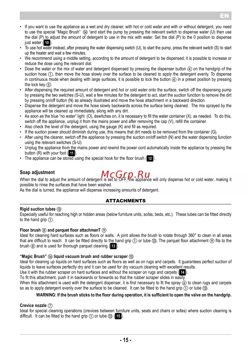 to use the special “Magic Brush” ⑭ “and start the pump by pressing the relevant switch to dispense water (U) then use
