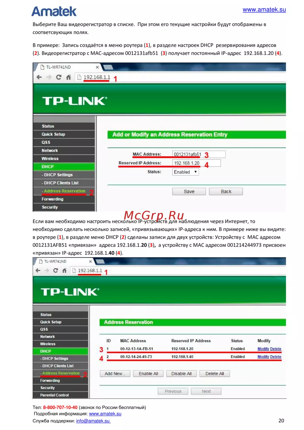 (2). Видеорегистратор с MAC-адресом 0012131afb51 (3) получает постоянный IP-адрес 192.168.1.20 (4).