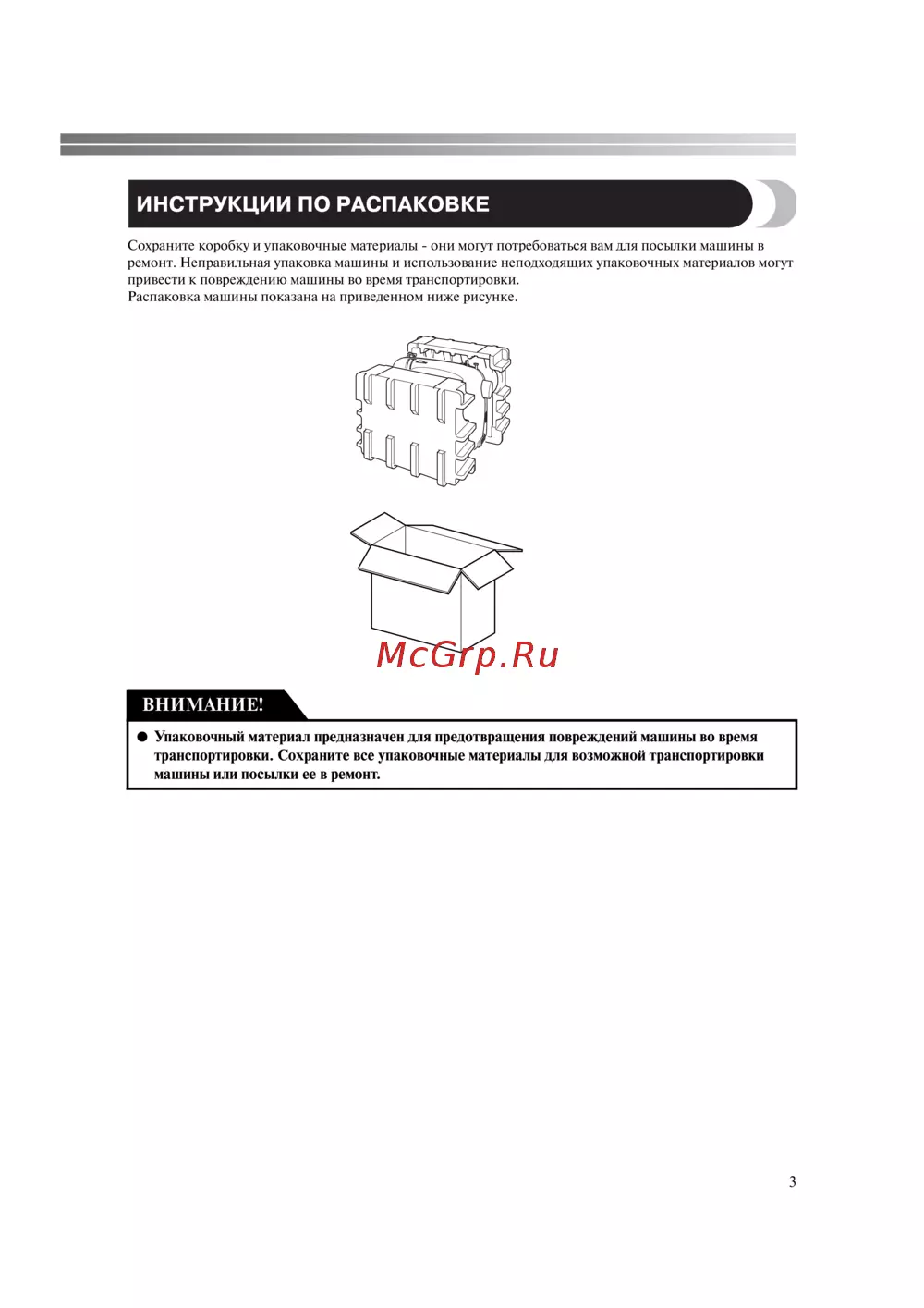 - Упаковочный материал предназначен для предотвращения повреждений машины во время транспортировки сохраните все упаковочные материалы для возможной транспортировки машины или посылки ее в ремонт p.4