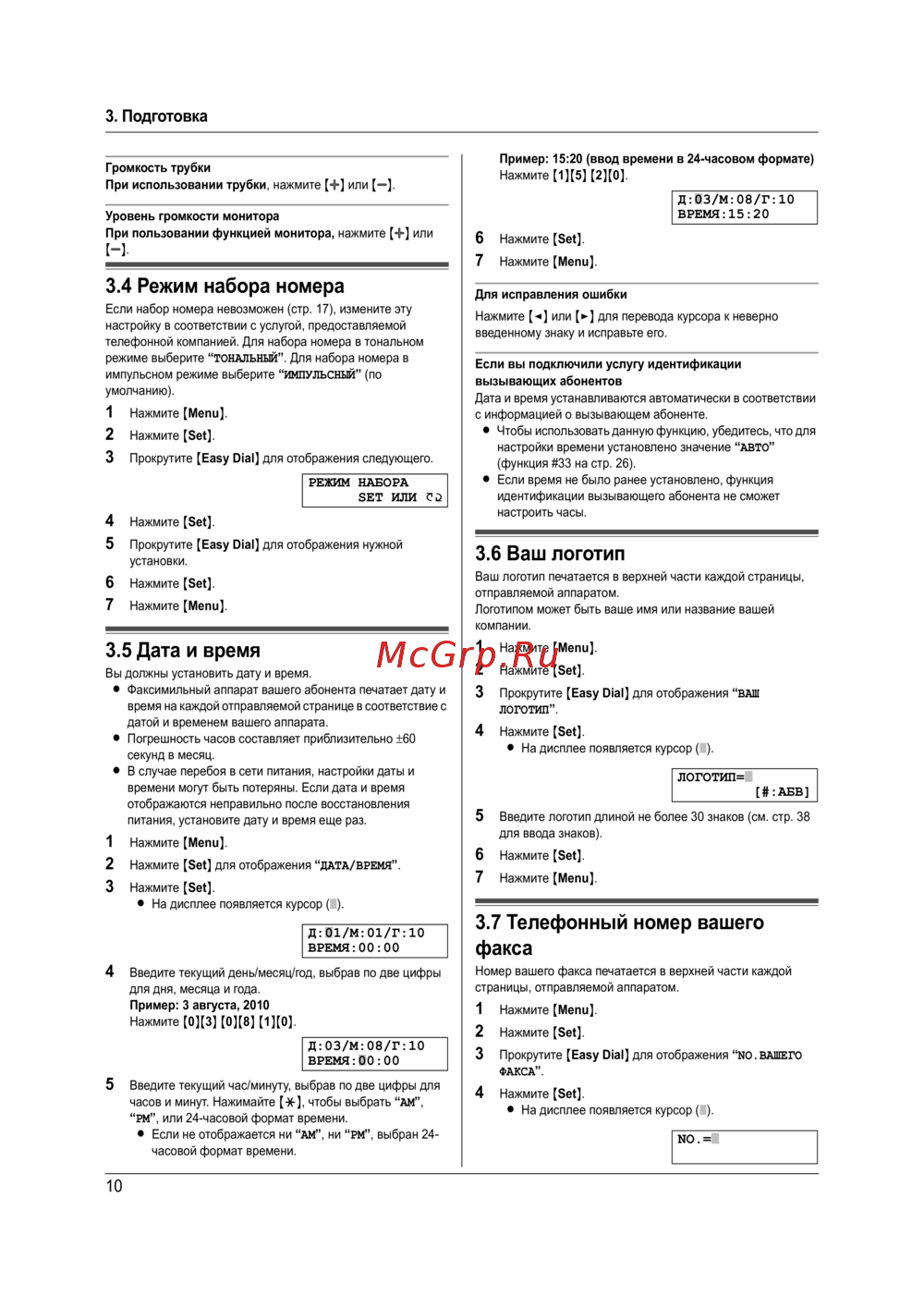 Panasonic KX-FT502RU-B — настройка телефона: громкость, дата и логотип [10/48]