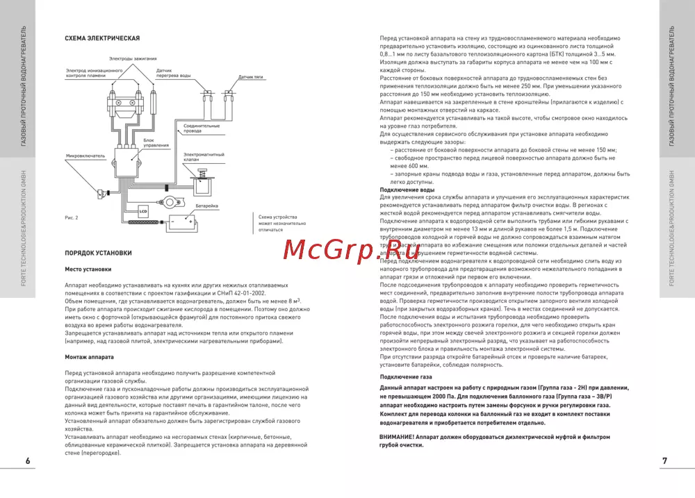 СХЕМА ЭЛЕКТРИЧЕСКАЯ Перед установкой аппарата на стену из трудновоспламеняемого материала необходимо предварительно установить изоляцию состоящую из оцинкованного листа толщиной 0 8 1 мм по листу базальтового теплоизоляционного картона БТК толщиной 3 5 мм Изоляция должна выступать за габариты корпуса аппарата не менее чем на 100 мм с каждой стороны Расстояние от боковых поверхностей аппарата до трудновоспламеняемых стен без применения теплоизоляции должно быть не менее 250 мм При уменьшении указанного FORTE TECHNOLOGIE PRODUKTION GMBH ГАЗОВЫЙ ПРОТОЧНЫЙ FORTE TECHNOLOGIE PRODUKTION GMBH ГАЗОВЫЙ ПРОТОЧНЫЙ расстояния до 150 мм необходимо установить теплоизоляцию Аппарат навешивается на закрепленные в стене кронштейны прилагаются к изделию с помощью монтажных отверстий на каркасе Аппарат рекомендуется устанавливать на такой высоте чтобы смотровое окно находилось на уровне глаз потребителя Для осуществления сервисного обслуживания при установке аппарата необходимо выдержать следующие зазоры расстояние от боковой поверхности аппарата до боковой стены не менее 150 мм свободное пространство перед лицевой поверхностью аппарата должно быть не менее 600 мм запорные краны подвода воды и газа установленные перед аппаратом должны быть легко доступны Подключение воды Для увеличения срока службы аппарата и улучшения его эксплуатационных характеристик рекомендуется устанавливать перед аппаратом фильтр очистки воды В регионах с жесткой водой рекомендуется перед аппаратом устанавливать смягчители воды Подключение аппарата к водопроводной сети выполнить трубами или гибкими рукавами с внутренним диаметром не менее 13 мм и длиной рукавов не более 1 5 м Подключение трубопроводов холодной и горячей воды не должно сопровождаться взаимным натягом труб и частей аппарата во избежание смещения или поломки отдельных деталей и частей ПОРЯДОК УСТАНОВКИ аппарата и нарушением герметичности водяной системы Место установки напорного трубопровода для предотвращения возможного нежелательного попадания в Перед подключением водонагревателя к водопроводной сети необходимо слить воду из аппарат грязи и отложений при первом его включении Аппарат необходимо устанавливать на кухнях или других нежилых отапливаемых После подсоединения трубопроводов к аппарату необходимо проверить герметичность помещениях в соответствии с проектом газификации и СНиП 42 01 2002 мест соединений предварительно заполнив внутренние полости трубопровода аппарата Объем помещения где устанавливается водонагреватель должен быть не менее 8 м3 водой Проверка герметичности производится открытием запорного вентиля холодной При работе аппарата происходит сжигание кислорода в помещении Поэтому оно должно воды при закрытых водоразборных кранах Течь в местах соединений не допускается иметь окно с форточкой открывающейся фрамугой для постоянного притока свежего После подключения воды и испытания трубопровода необходимо проверить воздуха во время работы водонагревателя работоспособность электронного розжига горелки для чего необходимо открыть кран Запрещается устанавливать аппарат над источником тепла или открытого пламени горячей воды при этом между свечей электронного розжига и секцией горелки должен например над газовой плитой электрическими нагревательными приборами произойти