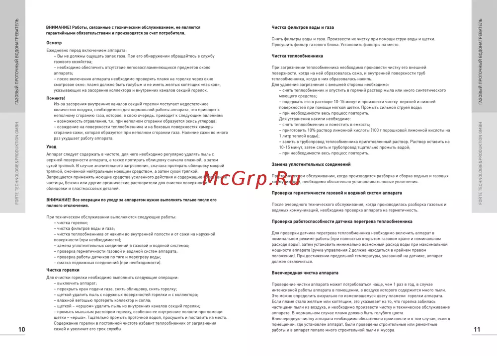 ВНИМАНИЕ Работы связанные с техническим обслуживанием не являются гарантийными обязательствами и производятся за счет потребителя Чистка фильтров воды и газа Снять фильтры воды и газа Произвести их чистку при помощи струи воды и щетки Осмотр Просушить фильтр газового блока Установить фильтры на место Ежедневно перед включением аппарата Вы не должны ощущать запах газа При его обнаружении обращайтесь в службу Чистка теплообменника необходимо обеспечить отсутствие легковоспламеняющихся предметов около При загрязнении теплообменника необходимо произвести чистку его внешней аппарата поверхности когда на ней образовалась сажа и внутренней поверхности труб после включения аппарата необходимо проверять пламя на горелке через окно теплообменника когда в них образовалась накипь смотровое окно пламя должно быть голубым и не иметь желтых коптящих языков Для удаления загрязнения с внешней стороны необходимо указывающих на засорение коллектора и внутренних каналов секций горелок Помните Из за засорения внутренних каналов секций горелки поступает недостаточное количество воздуха необходимого для нормальной работы аппарата что приводит к неполному сгоранию газа которое в свою очередь приводит к следующим явлениям возможность отравления т к при неполном сгорании образуется окись углерода осаждение на поверхности теплообменника и на боковых поверхностях камеры сгорания сажи которая образуется при неполном сгорании газа Наличие сажи во много раз ухудшает работу аппарата снять теплообменник и опустить в горячий раствор мыла или иного синтетического моющего средства подержать его в растворе 10 15 минут и произвести чистку верхней и нижней поверхностей при помощи мягкой щетки Промыть сильной струей воды при необходимости весь процесс повторить Для устранения накипи необходимо снять теплообменник и поместить в емкость приготовить 10 раствор лимонной кислоты 100 г порошковой лимонной кислоты на 1 литр теплой воды залить в трубопровод теплообменника приготовленный раствор Раствор оставить на Уход 10 15 минут затем слить и трубопровод тщательно промыть водой Аппарат следует содержать в чистоте для чего необходимо регулярно удалять пыль с при необходимости весь процесс повторить верхней поверхности аппарата а также протирать облицовку сначала влажной а затем сухой тряпкой В случае значительного загрязнения сначала протирать облицовку мокрой Замена уплотнительных соединений тряпкой смоченной нейтральным моющим средством а затем сухой тряпкой Запрещается применять моющие средства усиленного действия и содержащие абразивные При техническом обслуживании когда производится разборка и сборка водных и газовых частицы бензин или другие органические растворители для очистки поверхности коммуникаций необходимо обязательно устанавливать новые уплотнения облицовки и пластмассовых деталей Проверка герметичности газовой и водяной систем аппарата ВНИМАНИЕ Все операции по уходу за аппаратом нужно выполнять только после его полного отключения После очередного технического обслуживания когда производилась разборка газовых и FORTE TECHNOLOGIE PRODUKTION GMBH ГАЗОВЫЙ ПРОТОЧНЫЙ FORTE TECHNOLOGIE PRODUKTION GMBH ГАЗОВЫЙ ПРОТОЧНЫЙ газового хозяйства водяных коммуникаций необходима проверка аппарата на герметичность При техническом обслужи