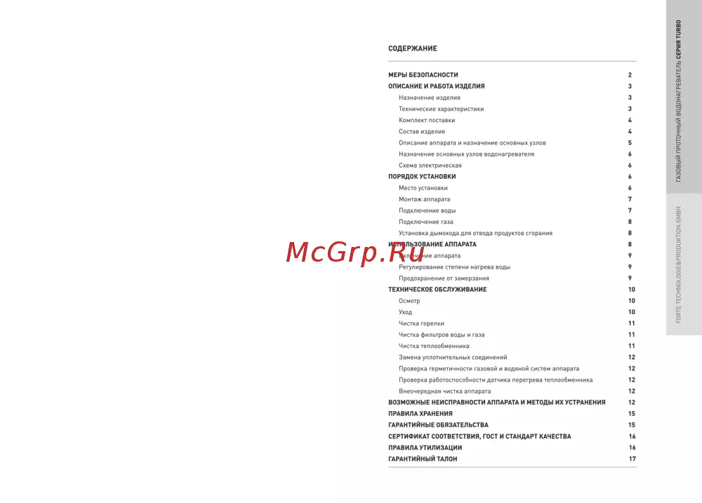 МЕРЫ БЕЗОПАСНОСТИ ОПИСАНИЕ И РАБОТА ИЗДЕЛИЯ 2 3 Назначение изделия 3 Технические характеристики 3 Комплект поставки 4 Состав изделия 4 Описание аппарата и назначение основных узлов 5 Назначение основных узлов водонагревателя 6 Схема электрическая 6 ПОРЯДОК УСТАНОВКИ 6 Место установки 6 Монтаж аппарата 7 Подключение воды 7 Подключение газа 8 Установка дымохода для отвода продуктов сгорания 8 ИСПОЛЬЗОВАНИЕ АППАРАТА 8 Включение аппарата 9 Регулирование степени нагрева воды 9 Предохранение от замерзания 9 ТЕХНИЧЕСКОЕ ОБСЛУЖИВАНИЕ Осмотр 10 10 Уход 10 Чистка горелки 11 Чистка фильтров воды и газа 11 Чистка теплообменника 11 Замена уплотнительных соединений 12 Проверка герметичности газовой и водяной систем аппарата 12 Проверка работоспособности датчика перегрева теплообменника 12 Внеочередная чистка аппарата 12 ВОЗМОЖНЫЕ НЕИСПРАВНОСТИ АППАРАТА И МЕТОДЫ ИХ УСТРАНЕНИЯ 12 ПРАВИЛА ХРАНЕНИЯ 15 ГАРАНТИЙНЫЕ ОБЯЗАТЕЛЬСТВА 15 СЕРТИФИКАТ СООТВЕТСТВИЯ ГОСТ И СТАНДАРТ КАЧЕСТВА 16 ПРАВИЛА УТИЛИЗАЦИИ 16 ГАРАНТИЙНЫЙ ТАЛОН 17 FORTE TECHNOLOGIE PRODUKTION GMBH ГАЗОВЫЙ ПРОТОЧНЫЙ ВОДОНАГРЕВАТЕЛЬ СЕРИЯ TURBO СОДЕРЖАНИЕ