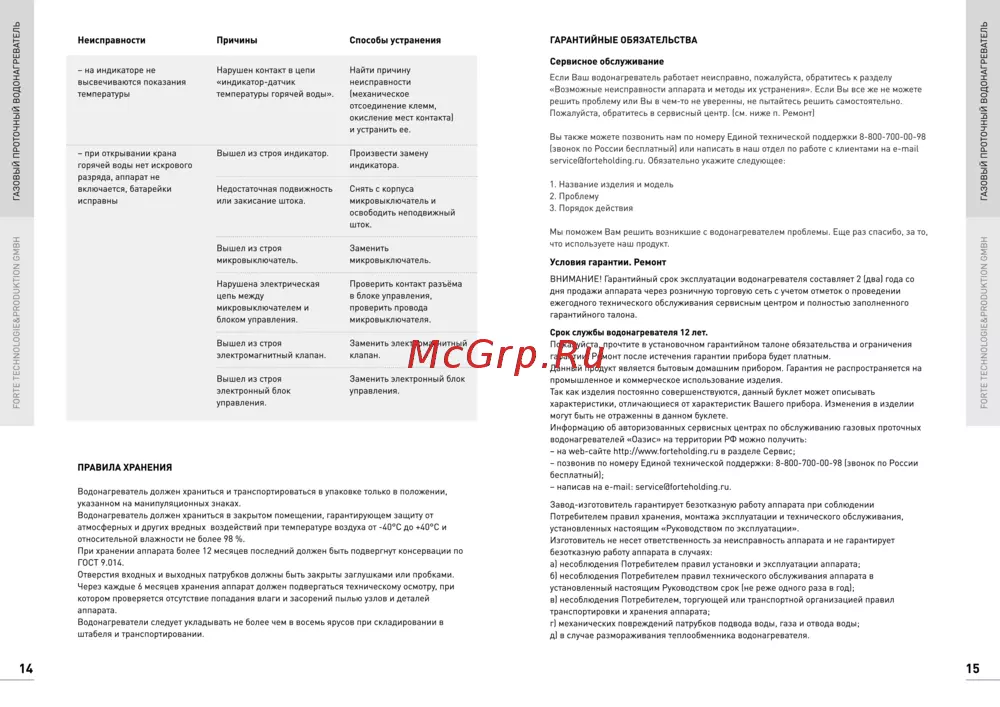 Неисправности Причины Способы устранения на индикаторе не Нарушен контакт в цепи Найти причину высвечиваются показания индикатор датчик неисправности ГАРАНТИЙНЫЕ ОБЯЗАТЕЛЬСТВА Сервисное обслуживание температуры температуры горячей воды механическое отсоединение клемм окисление мест контакта Если Ваш водонагреватель работает неисправно пожалуйста обратитесь к разделу Возможные неисправности аппарата и методы их устранения Если Вы все же не можете решить проблему или Вы в чем то не уверенны не пытайтесь решить самостоятельно Пожалуйста обратитесь в сервисный центр см ниже п Ремонт и устранить ее Вышел из строя индикатор горячей воды нет искрового Произвести замену индикатора звонок по России бесплатный или написать в наш отдел по работе с клиентами на e mail FORTE TECHNOLOGIE PRODUKTION GMBH ГАЗОВЫЙ ПРОТОЧНЫЙ FORTE TECHNOLOGIE PRODUKTION GMBH ГАЗОВЫЙ ПРОТОЧНЫЙ Вы также можете позвонить нам по номеру Единой технической поддержки 8 800 700 00 98 при открывании крана service0forteholding ru Обязательно укажите следующее разряда аппарат не включается батарейки Недостаточная подвижность Снять с корпуса исправны или закисание штока микровыключатель и освободить неподвижный 1 Название изделия и модель 2 Проблему 3 Порядок действия шток Мы поможем Вам решить возникшие с водонагревателем проблемы Еще раз спасибо за то Вышел из строя Заменить микровыключатель микро выключатель Нарушена электрическая Проверить контакт разъёма цепь между в блоке управления микровыключателем и проверить провода блоком управления микровыключателя Вышел из строя Заменить электромагнитный электромагнитный клапан клапан что используете наш продукт Условия гарантии Ремонт ВНИМАНИЕ Гарантийный срок эксплуатации водонагревателя составляет 2 два года со дня продажи аппарата через розничную торговую сеть с учетом отметок о проведении ежегодного технического обслуживания сервисным центром и полностью заполненного гарантийного талона Срок службы водонагревателя 12 лет Пожалуйста прочтите в установочном гарантийном талоне обязательства и ограничения гарантии Ремонт после истечения гарантии прибора будет платным Данный продукт является бытовым домашним прибором Гарантия не распространяется на Вышел из строя Заменить электронный блок промышленное и коммерческое использование изделия электронный блок управления Так как изделия постоянно совершенствуются данный буклет может описывать управления характеристики отличающиеся от характеристик Вашего прибора Изменения в изделии могут быть не отраженны в данном буклете Информацию об авторизованных сервисных центрах по обслуживанию газовых проточных водонагревателей Оазис на территории РФ можно получить на web сайте http www forteholding ru в разделе Сервис ПРАВИЛА ХРАНЕНИЯ позвонив по номеру Единой технической поддержки 8 800 700 00 98 звонок по России бесплатный Водонагреватель должен храниться и транспортироваться в упаковке только в положении указанном на манипуляционных знаках 14 написав на e mail service0forteholding ru Завод изготовитель гарантирует безотказную работу аппарата при соблюдении Водонагреватель должен храниться в закрытом помещении гарантирующем защиту от Потребителем правил хранения монтажа эксплуатации и технического обслуживания атмосферных и других вредных воздействий при температуре воздуха от 40 С до 40 С и установленны