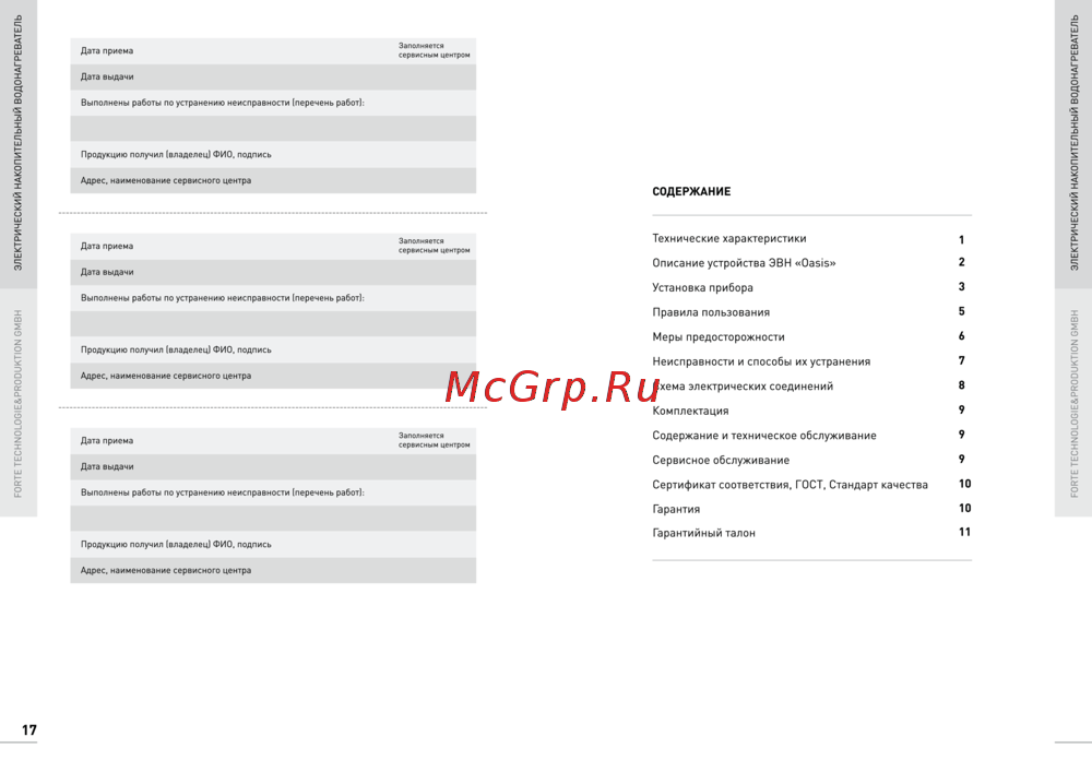 Дата выдачи Выполнены работы по устранению неисправности перечень работ Продукцию получил владелец ФИО подпись Адрес наименование сервисного центра СОДЕРЖАНИЕ Дата приема Заполняется сервисным центром Дата выдачи Технические характеристики 1 Описание устройства ЭВН Oasis 2 Установка прибора 3 Правила пользования 5 Меры предосторожности 6 Неисправности и способы их устранения 7 Схема электрических соединений 8 Комплектация 9 Содержание и техническое обслуживание 9 Сервисное обслуживание 9 Сертификат соответствия ГОСТ Стандарт качества 10 Гарантия 10 Гарантийный талон 11 Выполнены работы по устранению неисправности перечень работ Продукцию получил владелец ФИО подпись Адрес наименование сервисного центра Дата приема Заполняется сервисным центром Дата выдачи Выполнены работы по устранению неисправности перечень работ Продукцию получил владелец ФИО подпись Адрес наименование сервисного центра 17 Заполняется сервисным центром FORTE TECHNOLOGIE PRODUKTION GMBH ЭЛЕКТРИЧЕСКИЙ НАКОПИТЕЛЬНЫЙ ВОДОНАГРЕВАТЕЛЬ FORTE TECHNOLOGIE PRODUKTION GMBH ЭЛЕКТРИЧЕСКИЙ НАКОПИТЕЛЬНЫЙ ВОДОНАГРЕВАТЕЛЬ Дата приема