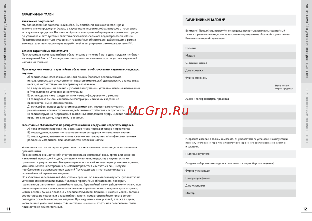 11 Уважаемые покупатели Мы благодарим Вас за сделанный выбор Вы приобрели высококачественную и технологичную продукцию Однако в случае возникновения любых вопросов относительно эксплуатации продукции Вы можете обратиться в сервисный центр или изучить инструкцию по установке и эксплуатации электрического накопительного водонагревателя Oasis Просим вас ознакомиться с условиями гарантийных обязательств действующих в рамках законодательства о защите прав потребителей и регулируемых законодательством РФ ГАРАНТИЙНЫЙ ТАЛОН Внимание Пожалуйста потребуйте от продавца полностью заполнить гарантийный талон и отрывные талоны правила заполнения приведены на обратной стороне талона Заполняется фирмой продавцом Изделие Условия гарантийных обязательств Производитель несет гарантийные обязательства в течение 5 лет с даты продажи прибора на внутренний бак и 12 месяцев на электрические элементы при отсутствии нарушений настоящий условий Производитель не несет гарантийные обязательства обслуживания изделия в следующих случаях А если изделие предназначенное для личных бытовых семейных нужд использовалось для осуществления предпринимательской деятельности а также иных целях не соответствующих его прямому назначению Б в случае нарушения правил и условий эксплуатации установки изделия изложенных в Руководстве по установке и эксплуатации В если изделие имеет следы попыток неквалифицированного ремонта Г если дефект вызван изменением конструкции или схемы изделия не предусмотренными Изготовителем Д если дефект вызван действием неодолимых сил несчастными случаями умышленными или неосторожными действиями потребителя или третьих лиц Е если обнаружены повреждения вызванные попаданием внутрь изделия посторонних предметов веществ жидкостей насекомых Гарантийные обязательства не распространяются на следующие недостатки изделия А механические повреждения возникшие после передачи товара потребителю Б повреждения вызванные несоответствием стандартам коммунальных систем В повреждения вызванные использованием нестандартных и или некачественных расходных материалов принадлежностей запасных частей Установка и монтаж аппарата осуществляется самостоятельно или специализированными организациями Производитель снимает с себя ответственность за возможный вред прямо или косвенно нанесенный продукцией людям домашним животным имуществу в случае если это произошло в результате несоблюдения правил и условий эксплуатации установки изделия умышленных или неосторожных действий потребителя или третьих лиц В случае несоблюдения вышеизложенных условий Производитель имеет право отказать в гарантийном обслуживании изделия Во избежание недоразумений убедительно просим Вас внимательно изучить Руководство по установке и эксплуатации изделий условия гарантийных обязательств проверить правильность заполнения гарантийного талона Гарантийный талон действителен только при наличии правильно и четко указанных модели серийного номера изделия даты продажи четких печатей фирмы продавца и подписи покупателя Серийный номер и модель должны соответствовать указанным в гарантийном талоне номер гарантийного талона должен совпадать с серийным номером изделия При нарушении этих условий а также в случае когда данные ука