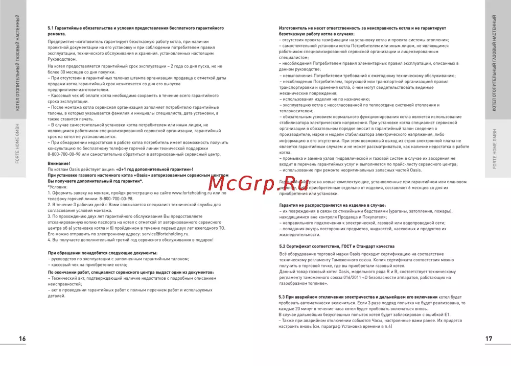 Изготовитель не несет ответственность за неисправность котла и не гарантирует ремонта безотказную работу котла в случаях Предприятие изготовитель гарантирует безотказную работу котла при наличии отсутствия проекта газификации на установку котла и проекта системы отопления проектной документации на его установку и при соблюдении потребителем правил самостоятельной установки котла Потребителем или иным лицом не являющимся работником специализированной сервисной организации и лицензированным эксплуатации технического обслуживания и хранения установленных настоящим Руководством На котел предоставляется гарантийный срок эксплуатации 2 года со дня пуска но не более 30 месяцев со дня покупки При отсутствии в гарантийных талонах штампа организации продавца с отметкой даты продажи котла гарантийный срок исчисляется со дня его выпуска предприятием изготовителем Кассовый чек об оплате котла необходимо сохранять в течение всего гарантийного срока эксплуатации После монтажа котла сервисная организация заполняет потребителю гарантийные талоны в которых указывается фамилия и инициалы специалиста дата установки а также ставится печать В случае самостоятельной установки котла потребителем или иным лицом не являющимся работником специализированной сервисной организации гарантийный срок на котел не устанавливается FORTE HOME GMBH КОТЕЛ ОТОПИТЕЛЬНЫЙ ГАЗОВЫЙ НАСТЕННЫЙ FORTE HOME GMBH КОТЕЛ ОТОПИТЕЛЬНЫЙ ГАЗОВЫЙ НАСТЕННЫЙ 5 1 Гарантийные обязательства и условия предоставления бесплатного гарантийного специалистом несоблюдения Потребителем правил элементарных правил эксплуатации описанных в данном руководстве невыполнения Потребителем требований к ежегодному техническому обслуживанию несоблюдения Потребителем торгующей или транспортной организацией правил транспортировки и хранения котла о чем могут свидетельствовать видимые механические повреждения использования изделия не по назначению эксплуатацию котла с несогласованной по теплоотдаче системой отопления и теплоносителем обязательным условием нормального функционирования котла является использование стабилизатора электрического напряжения При установке котла специалист сервисной организации в обязательном порядке вносит в гарантийный талон сведения о производителе марке и модели стабилизатора электрического напряжения либо При обнаружении недостатков в работе котла потребитель имеет возможность получить информацию о его отсутствии При этом возможный выход из строя электронной платы не консультацию по бесплатному телефону горячей линии технической поддержки является гарантийным случаем и не может рассматриваться как наличие недостатка в работе 8 800 700 00 98 или самостоятельно обратиться в авторизованный сервисный центр котла Внимание промывка и замена узлов гидравлической и газовой систем в случае их засорения не входит в перечень гарантийных услуг и выполняется по прайс листу сервисного центра По котлам Oasis действует акция 2 1 год дополнительной гарантии использование при ремонте неоригинальных запасных частей Oasis При установке газового настенного котла Oasis авторизованным сервисным центром Вы получаете дополнительный год гарантии Гарантийный срок на новые комплектующие установленные при гарантийном или плановом Условия ремонте либо 