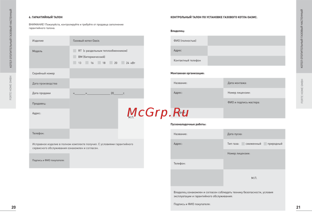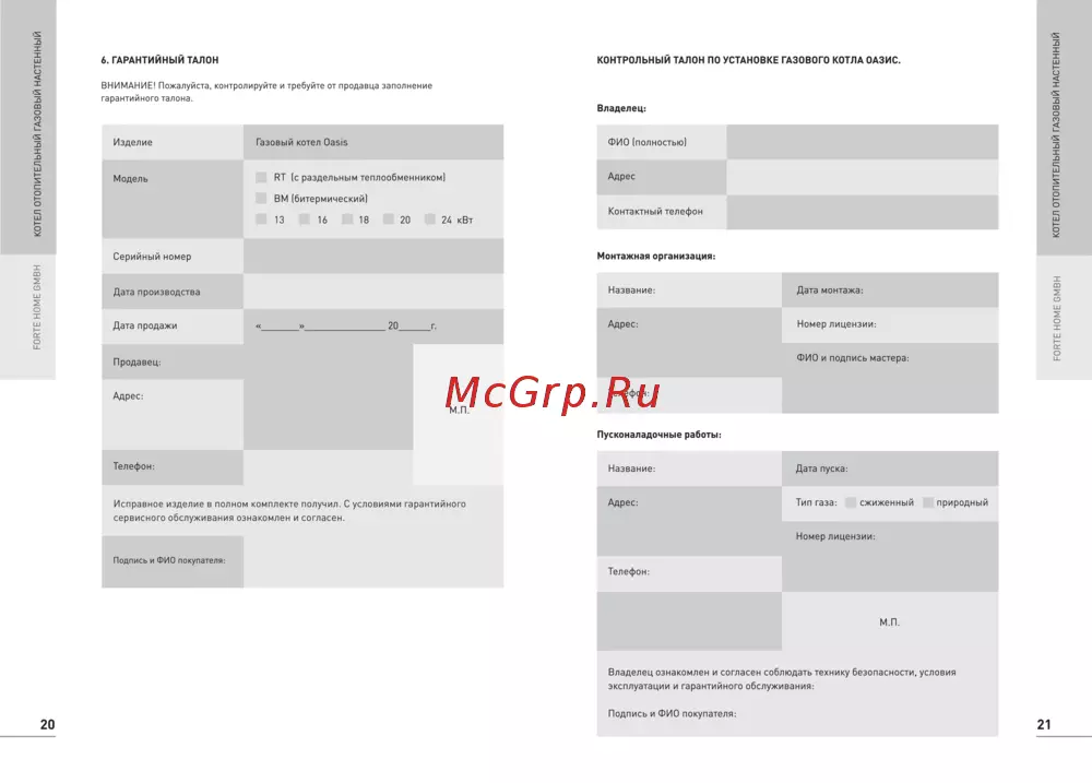 КОНТРОЛЬНЫЙ ТАЛОН ПО УСТАНОВКЕ ГАЗОВОГО КОТЛА ОАЗИС FORTE HOME GMBH КОТЕЛ ОТОПИТЕЛЬНЫЙ ГАЗОВЫЙ НАСТЕННЫЙ FORTE HOME GMBH КОТЕЛ ОТОПИТЕЛЬНЫЙ ГАЗОВЫЙ НАСТЕННЫЙ 6 ГАРАНТИЙНЫЙ ТАЛОН ВНИМАНИЕ Пожалуйста контролируйте и требуйте от продавца заполнение гарантийного талона Владелец Изделие Модель Газовый котел Oasis ФИО полностью Адрес RT с раздельным теплообменником ВМ битермический Контактный телефон 13 16 18 20 24 кВт Серийный номер Монтажная организация Дата производства Дата продажи 20 г Название Дата монтажа Адрес Номер лицензии ФИО и подпись мастера Продавец Телефон Адрес М П Пусконаладочные работы Телефон Название Дата пуска Исправное изделие в полном комплекте получил С условиями гарантийного Адрес Тип газа сжиженный природный сервисного обслуживания ознакомлен и согласен Номер лицензии Подпись и ФИО покупателя Телефон М П Владелец ознакомлен и согласен соблюдать технику безопасности условия эксплуатации и гарантийного обслуживания Подпись и ФИО покупателя 20 21