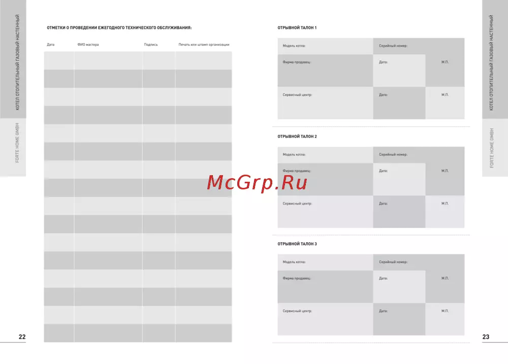 ОТРЫВНОЙ ТАЛОН 1 Модель котла Серийный номер Фирма продавец Дата м п Сервисный центр Дата м п FORTE HOME GMBH КОТЕЛ ОТОПИТЕЛЬНЫЙ ГАЗОВЫЙ НАСТЕННЫЙ FORTE HOME GMBH КОТЕЛ ОТОПИТЕЛЬНЫЙ ГАЗОВЫЙ НАСТЕННЫЙ ОТМЕТКИ О ПРОВЕДЕНИИ ЕЖЕГОДНОГО ТЕХНИЧЕСКОГО ОБСЛУЖИВАНИЯ ОТРЫВНОЙ ТАЛОН 2 Модель котла Серийный номер Фирма продавец Дата М П Сервисный центр Дата м п ОТРЫВНОЙ ТАЛОН 3 22 Модель котла Серийный номер Фирма продавец Дата М П Сервисный центр Дата м п 23