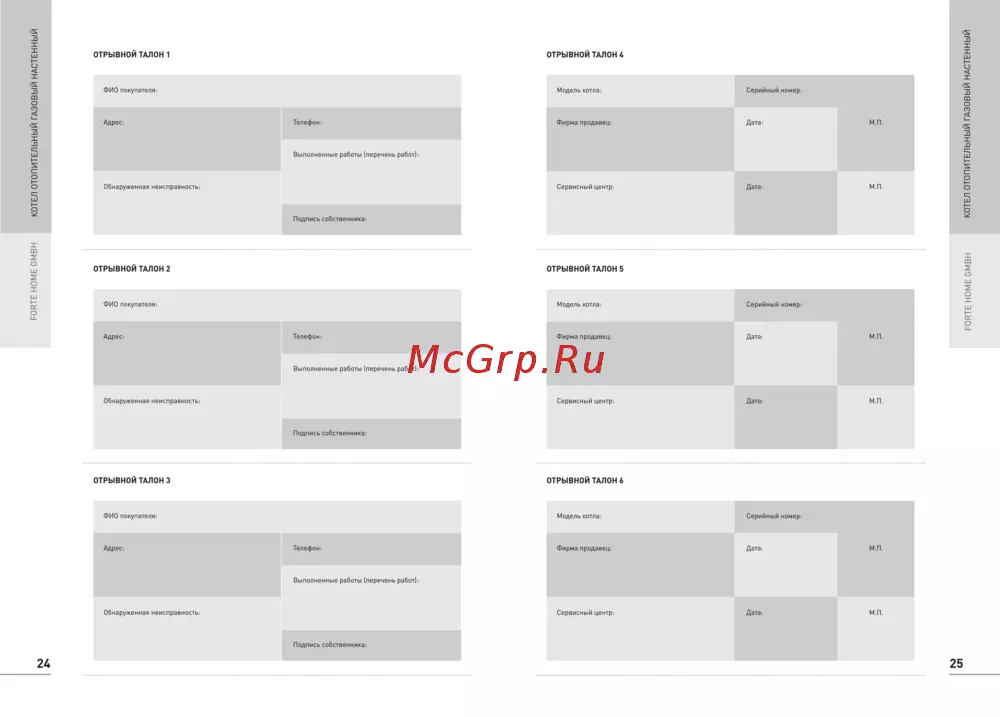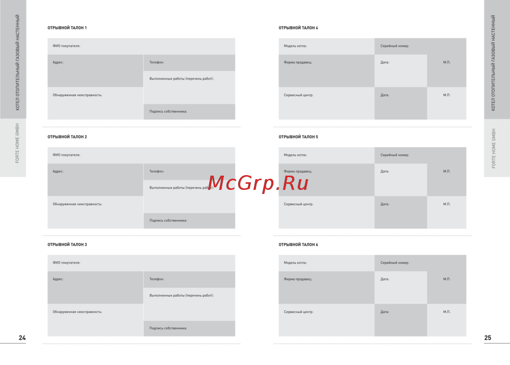 ОТРЫВНОЙ ТАЛОН 4 ФИО покупателя Адрес Телефон Модель котла Серийный номер Фирма продавец Дата М П Сервисный центр Дата М П Выполненные работы перечень работ Обнаруженная неисправность Подпись собственника ОТРЫВНОЙ ТАЛОН 2 ОТРЫВНОЙ ТАЛОН 5 ФИО покупателя Адрес Телефон Модель котла Серийный номер Фирма продавец Дата М П Сервисный центр Дата М П Выполненные работы перечень работ Обнаруженная неисправность Подпись собственника ОТРЫВНОЙ ТАЛОН 3 ОТРЫВНОЙ ТАЛОН 6 ФИО покупателя Адрес Телефон Модель котла Серийный номер Фирма продавец Дата М П Сервисный центр Дата М П Выполненные работы перечень работ Обнаруженная неисправность Подпись собственника 24 FORTE HOME GMBH КОТЕЛ ОТОПИТЕЛЬНЫЙ ГАЗОВЫЙ НАСТЕННЫЙ FORTE HOME GMBH КОТЕЛ ОТОПИТЕЛЬНЫЙ ГАЗОВЫЙ НАСТЕННЫЙ ОТРЫВНОЙ ТАЛОН 1