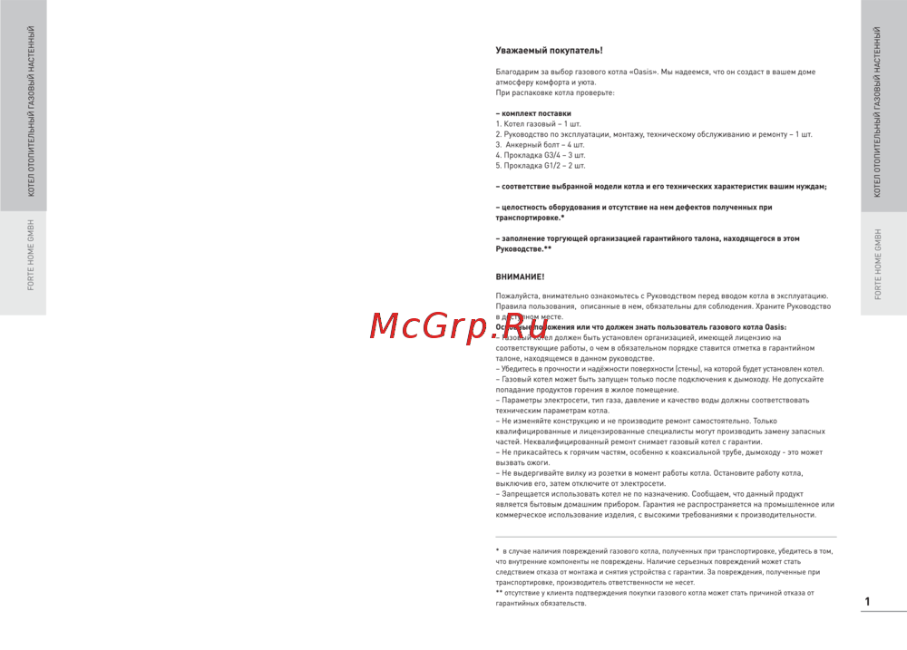 FORTE HOME GMBH КОТЕЛ ОТОПИТЕЛЬНЫЙ ГАЗОВЫЙ НАСТЕННЫЙ Уважаемый покупатель Благодарим за выбор газового котла Oasis Мы надеемся что он создаст в вашем доме атмосферу комфорта и уюта При распаковке котла проверьте комплект поставки 1 Котел газовый 1 шт 2 Руководство по эксплуатации монтажу техническому обслуживанию и ремонту 1 шт 3 Анкерный болт 4 шт 4 Прокладка G3 4 3 шт 5 Прокладка G1 2 2 шт соответствие выбранной модели котла и его технических характеристик вашим нуждам целостность оборудования и отсутствие на нем дефектов полученных при транспортировке заполнение торгующей организацией гарантийного талона находящегося в этом Руководстве ВНИМАНИЕ Пожалуйста внимательно ознакомьтесь с Руководством перед вводом котла в эксплуатацию Правила пользования описанные в нем обязательны для соблюдения Храните Руководство в доступном месте Основные положения или что должен знать пользователь газового котла Oasis Газовый котел должен быть установлен организацией имеющей лицензию на соответствующие работы о чем в обязательном порядке ставится отметка в гарантийном талоне находящемся в данном руководстве Убедитесь в прочности и надёжности поверхности стены на которой будет установлен котел Газовый котел может быть запущен только после подключения к дымоходу Не допускайте попадание продуктов горения в жилое помещение Параметры электросети тип газа давление и качество воды должны соответствовать техническим параметрам котла Не изменяйте конструкцию и не производите ремонт самостоятельно Только квалифицированные и лицензированные специалисты могут производить замену запасных частей Неквалифицированный ремонт снимает газовый котел с гарантии Не прикасайтесь к горячим частям особенно к коаксиальной трубе дымоходу это может вызвать ожоги Не выдергивайте вилку из розетки в момент работы котла Остановите работу котла выключив его затем отключите от электросети Запрещается использовать котел не по назначению Сообщаем что данный продукт является бытовым домашним прибором Гарантия не распространяется на промышленное или коммерческое использование изделия с высокими требованиями к производительности в случае наличия повреждений газового котла полученных при транспортировке убедитесь в том что внутренние компоненты не повреждены Наличие серьезных повреждений может стать следствием отказа от монтажа и снятия устройства с гарантии За повреждения полученные при транспортировке производитель ответственности не несет отсутствие у клиента подтверждения покупки газового котла может стать причиной отказа от гарантийных обязательств