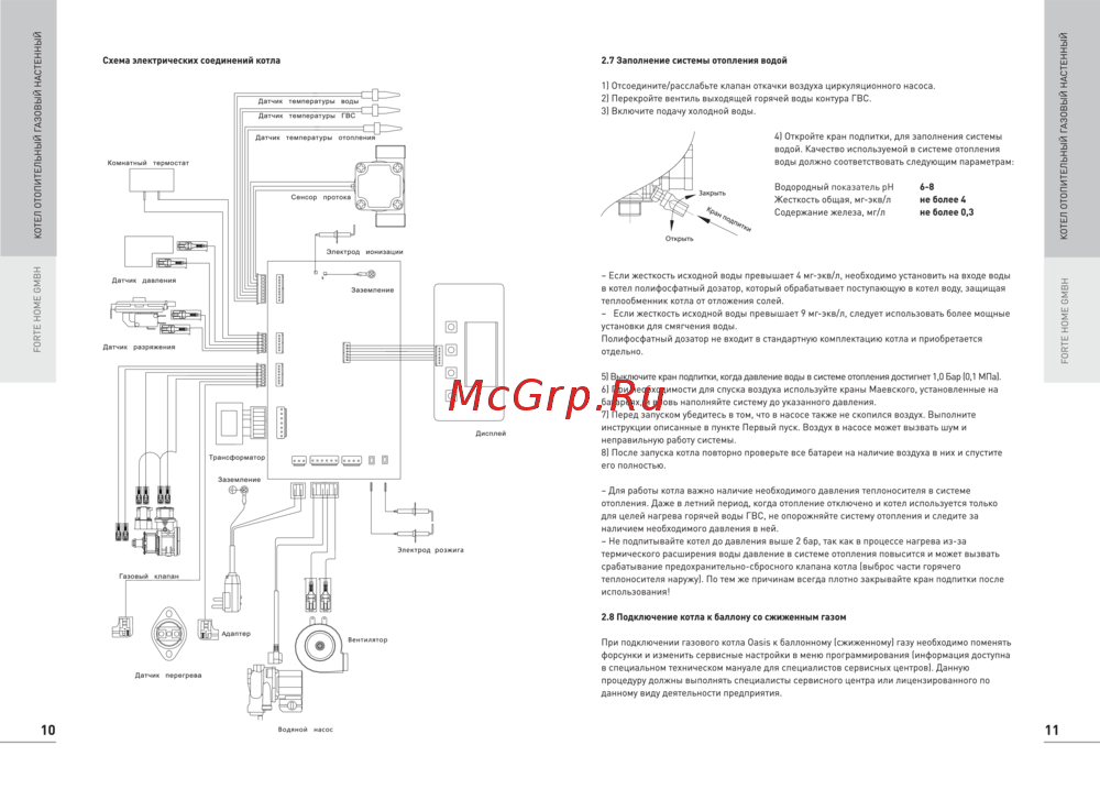 FORTE HOME GMBH КОТЕЛ ОТОПИТЕЛЬНЫЙ ГАЗОВЫЙ НАСТЕННЫЙ 2 7 Заполнение системы отопления водой FORTE HOME GMBH КОТЕЛ ОТОПИТЕЛЬНЫЙ ГАЗОВЫЙ НАСТЕННЫЙ Схема электрических соединений котла 1 Отсоедините расслабьте клапан откачки воздуха циркуляционного насоса 2 Перекройте вентиль выходящей горячей воды контура ГВС 3 Включите подачу холодной воды 4 Откройте кран подпитки для заполнения системы водой Качество используемой в системе отопления воды должно соответствовать следующим параметрам Водородный показатель pH Жесткость общая мг экв л 6 8 Содержание железа мг л не более 0 3 не более 4 Если жесткость исходной воды превышает 4 мг экв л необходимо установить на входе воды в котел полифосфатный дозатор который обрабатывает поступающую в котел воду защищая теплообменник котла от отложения солей Если жесткость исходной воды превышает 9 мг экв л следует использовать более мощные установки для смягчения воды Полифосфатный дозатор не входит в стандартную комплектацию котла и приобретается отдельно 5 Выключите кран подпитки когда давление воды в системе отопления достигнет 1 0 Бар 0 1 МПа 6 При необходимости для спуска воздуха используйте краны Маевского установленные на батареях и вновь наполняйте систему до указанного давления 7 Перед запуском убедитесь в том что в насосе также не скопился воздух Выполните инструкции описанные в пункте Первый пуск Воздух в насосе может вызвать шум и неправильную работу системы 8 После запуска котла повторно проверьте все батареи на наличие воздуха в них и спустите его полностью Для работы котла важно наличие необходимого давления теплоносителя в системе отопления Даже в летний период когда отопление отключено и котел используется только для целей нагрева горячей воды ГВС не опорожняйте систему отопления и следите за наличием необходимого давления в ней Не подпитывайте котел до давления выше 2 бар так как в процессе нагрева из за термического расширения воды давление в системе отопления повысится и может вызвать срабатывание предохранительно сбросного клапана котла выброс части горячего теплоносителя наружу По тем же причинам всегда плотно закрывайте кран подпитки после использования 2 8 Подключение котла к баллону со сжиженным газом При подключении газового котла Oasis к баллонному сжиженному газу необходимо поменять форсунки и изменить сервисные настройки в меню программирования информация доступна в специальном техническом мануале для специалистов сервисных центров Данную процедуру должны выполнять специалисты сервисного центра или лицензированного по данному виду деятельности предприятия 10 Водяной насос 11
