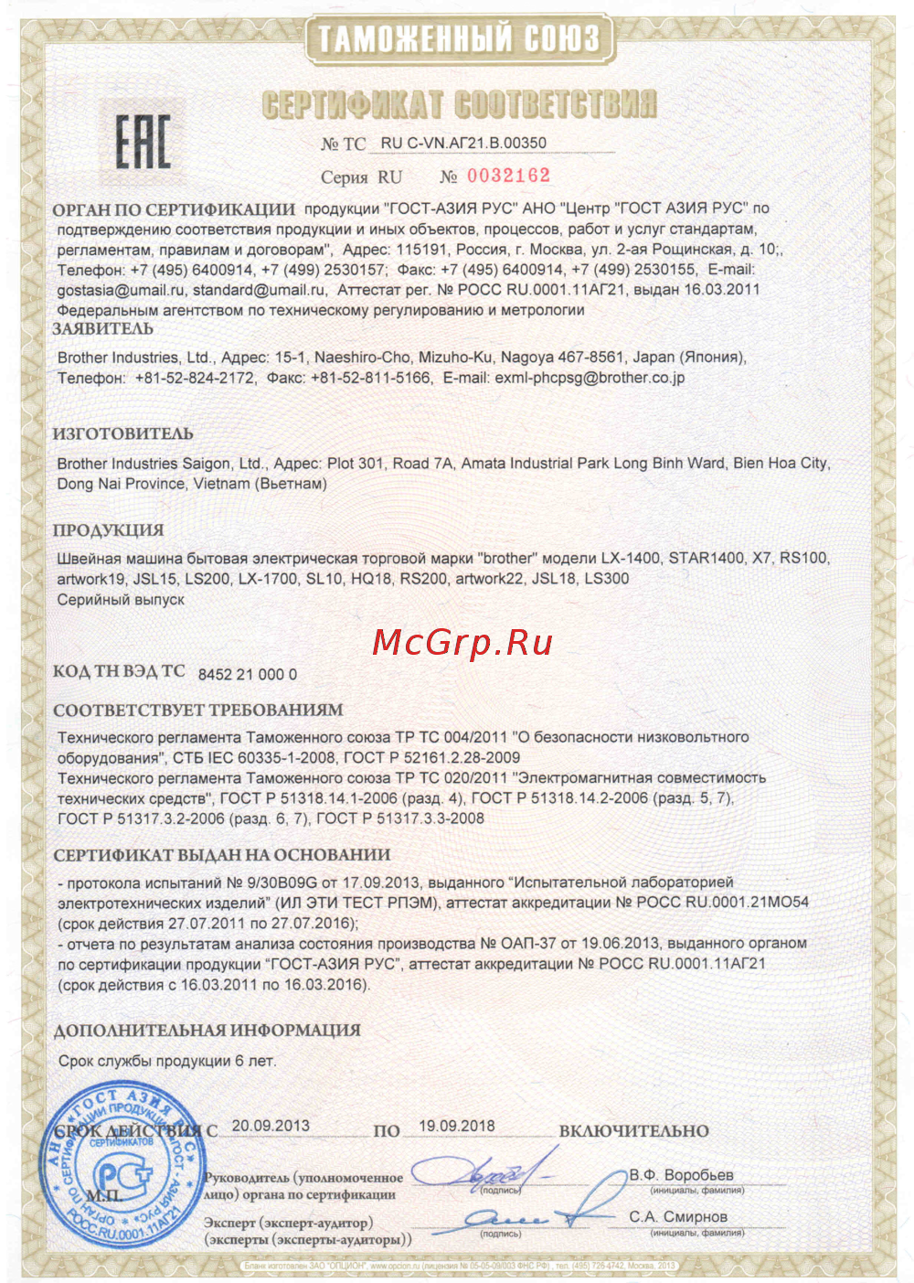 tm TC RUC VN Ar21 B 00350 Серия RU 0032162 ОРГАН ПО СЕРТИФИКАЦИИ продукции ТОСТ АЗИЯ РУС АНО Центр ТОСТ АЗИЯ РУС по подтверждению соответствия продукции и иных объектов процессов работ и услуг стандартам регламентам правилам и договорам Адрес 115191 Россия г Москва ул 2 ая Рощинская д 10 Телефон 7 495 6400914 7 499 2530157 Факс 7 495 6400914 7 499 2530155 E mail gostasia umail ru standard umail ru Аттестат per РОСС RU 0001 11АГ21 выдан 16 03 2011 Федеральным агентством по техническому регулированию и метрологии ЗАЯВИТЕЛЬ Brother Industries Ltd Адрес 15 1 Naeshiro Cho Mizuho Ku Nagoya 467 8561 Japan Япония Телефон 81 52 824 2172 Факс 81 52 811 5166 E mail exml phcpsg brother co jp ИЗГОТОВИТЕЛЬ Brother Industries Saigon Ltd Адрес Plot 301 Road 7A Amata Industrial Park Long Binh Ward Bien Hoa City Dong Nai Province Vietnam Вьетнам ПРОДУКЦИЯ Швейная машина бытовая электрическая торговой марки brother модели LX 1400 STAR1400 Х7 RS100 artwork19 JSL15 LS200 LX 1700 SL10 HQ18 RS200 artwork22 JSL18 LS300 Серийный выпуск КОДТНВЭДТС 8452 21 000 0 СООТВЕТСТВУЕТ ТРЕБОВАНИЯМ Технического регламента Таможенного союза ТР ТС 004 2011 О безопасности низковольтного оборудования СТБ IEC 60335 1 2008 ГОСТ Р 52161 2 28 2009 Технического регламента Таможенного союза ТР ТС 020 2011 Электромагнитная совместимость технических средств ГОСТ Р 51318 14 1 2006 разд 4 ГОСТ Р 51318 14 2 2006 разд 5 7 ГОСТ Р 51317 3 2 2006 разд 6 7 ГОСТ Р 51317 3 3 2008 СЕРТИФИКАТ ВЫДАН НА ОСНОВАНИИ протокола испытаний 9 30B09G от 17 09 2013 выданного Испытательной лабораторией электротехнических изделий ИП ЭТИ ТЕСТ РПЭМ аттестат аккредитации РОСС RU 0001 21MO54 срок действия 27 07 2011 по 27 07 2016 отчета по результатам анализа состояния производства ОАП 37 от 19 06 2013 выданного органом по сертификации продукции ГОСТ АЗИЯ РУС аттестат аккредитации РОСС RU 0001 11Ar21 срок действия с 16 03 2011 по 16 03 2016 ДОПОЛНИТЕЛЬНАЯ ИНФОРМАЦИЯ Срок службы продукции 6 лет 20 09 2013 по 19 09 2018 ВКЛЮЧИТЕЛЬНО кТОВ Руководитель уполномоченное лицо органа по сертификации Эксперт эксперт аудитор эксперты эксперты аудиторы В Ф Воробьев подпис инициалы фамилия С А Смирнов подпись инициалы фамилия