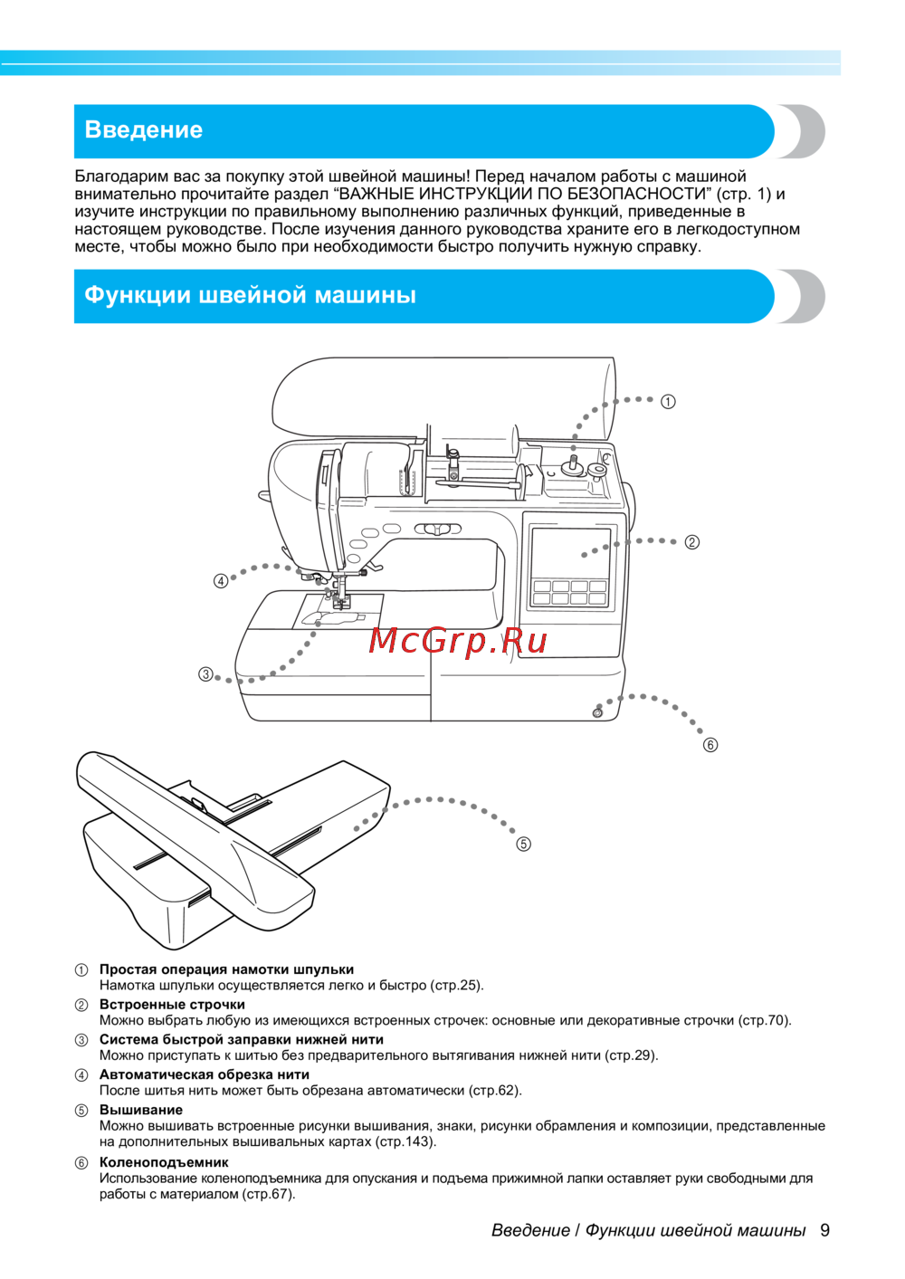 - Благодарим вас за покупку этой швейной машины перед началом работы с машиной внимательно прочитайте раздел важные инструкции по безопасности стр 1 и изучите инструкции по правильному выполнению различных функций приведенные в настоящем руководстве после изучения данного руководства храните его в легкодоступном месте чтобы можно было при необходимости быстро получить нужную справку p.11