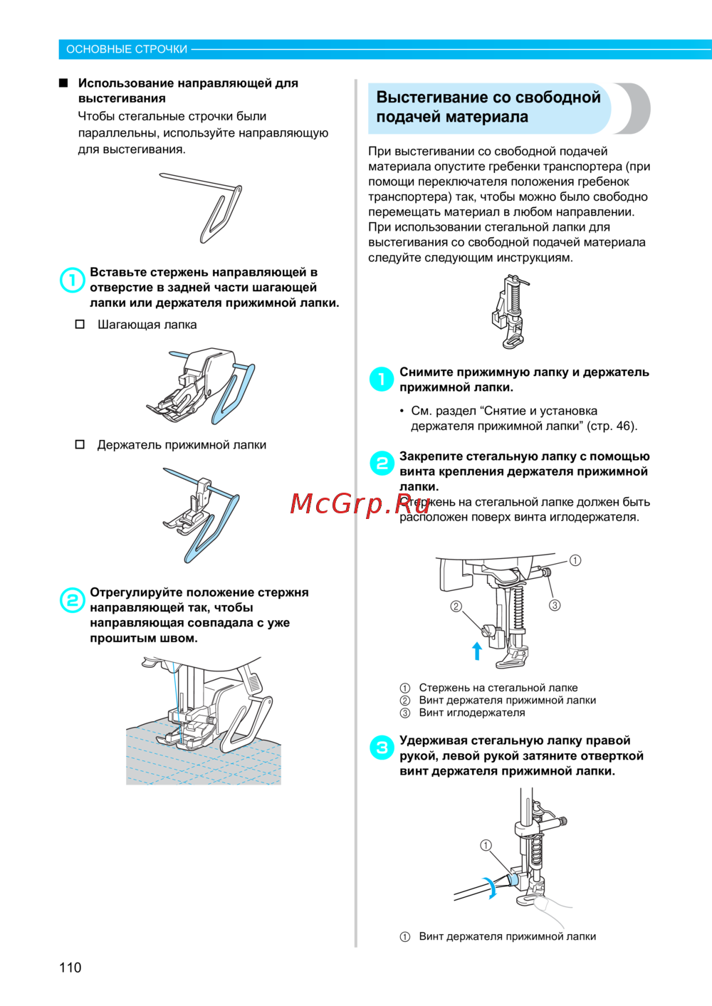 Узнайте, как правильно использовать направляющую для стегания и технику свободной подачи материала. Пошаговые инструкции для достижения идеальных стежков.