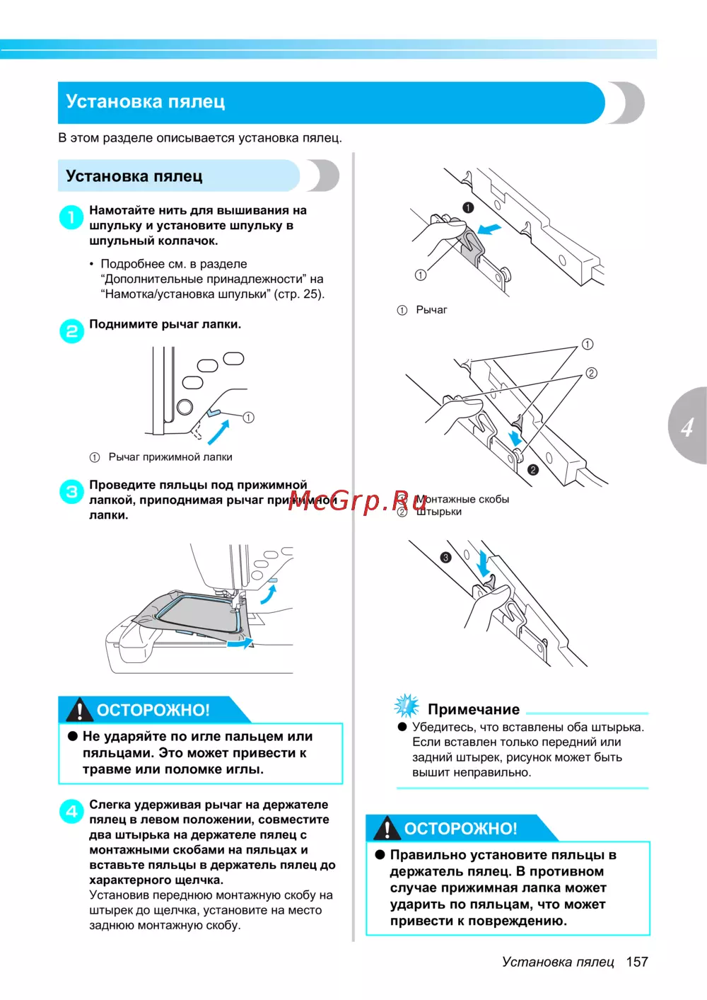 - Запрещается опускать иглу во время перемещения пялец игла может погнуться или сломаться при корректировке рисунка проверьте отображение доступных пялец и используйте соответствующие пяльцы при использовании пялец которые не отображаются как доступные для использования прижимная лапка во время вышивания может ударить по пяльцам что может привести к травме p.174