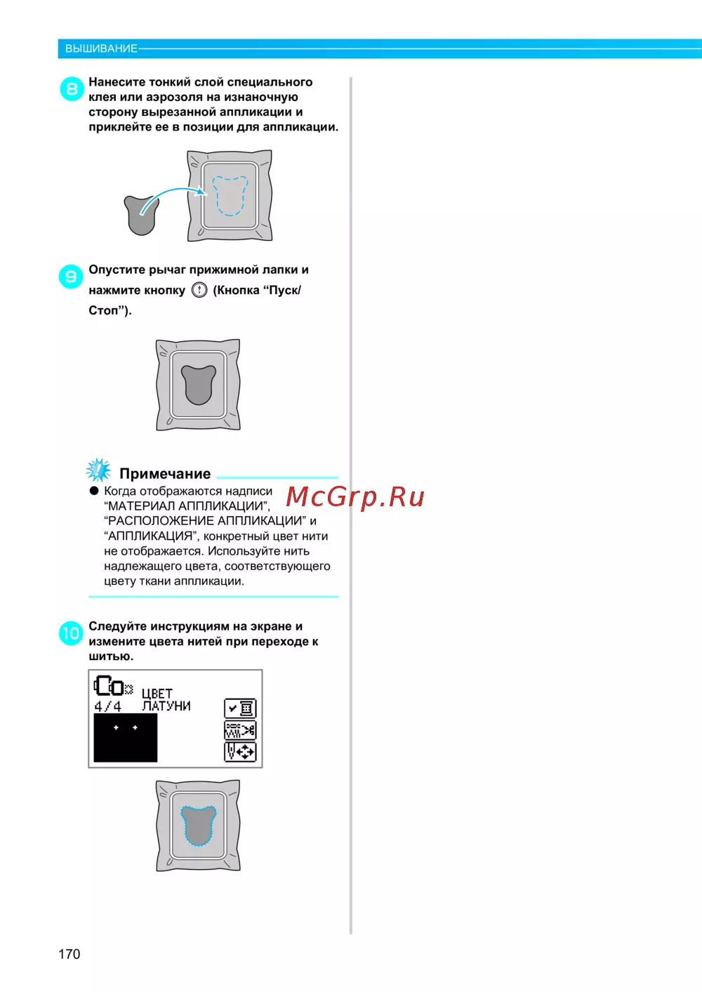 - После появления на экране надписи материал аппликации прикрепите с помощью утюга стабилизирующий материал к изнаночной стороне ткани для аппликации и натяните ее на пяльцы p.171