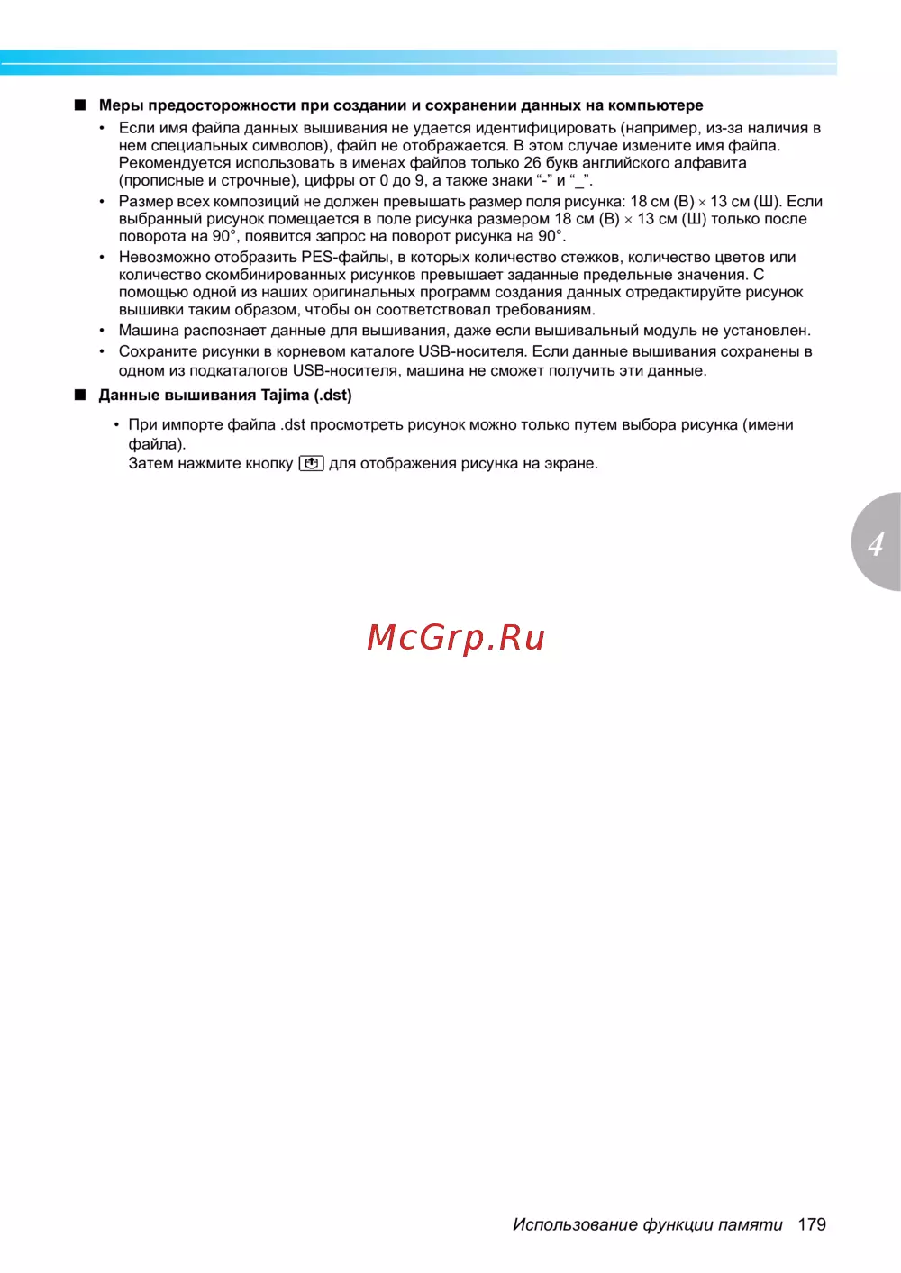 - Меры предосторожности при работе с данными вышивания p.180