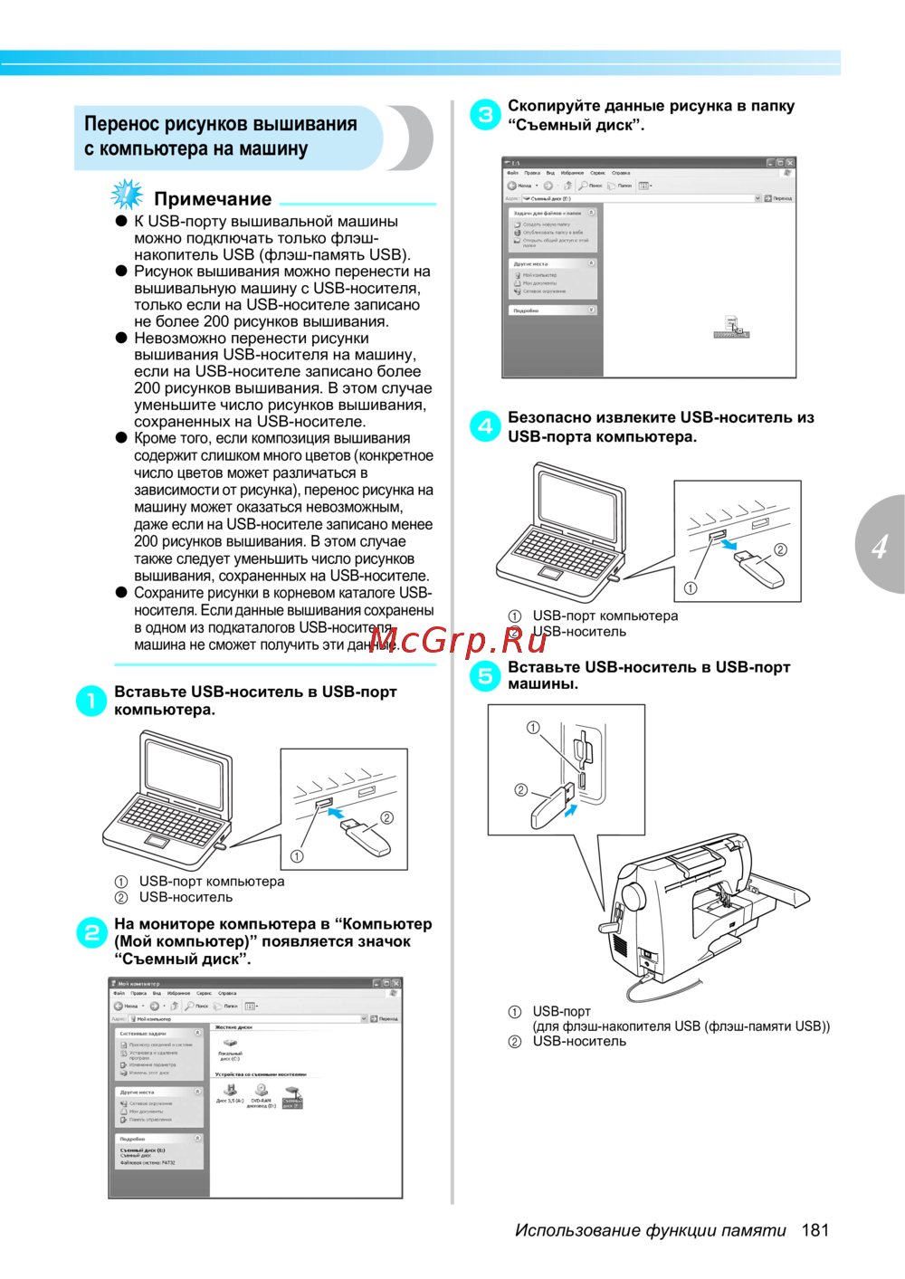 - Перенос рисунков вышивания с компьютера на машину p.183