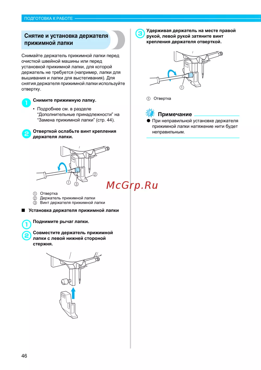 Узнайте, как правильно снять и установить держатель прижимной лапки для швейной машины. Следуйте пошаговым инструкциям для качественной работы.