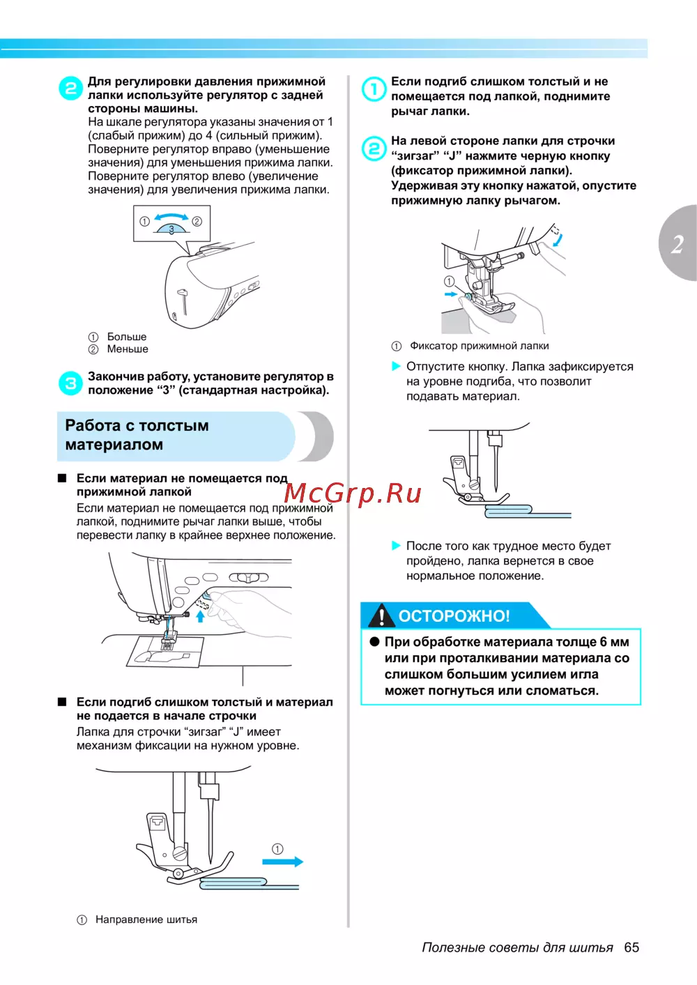 Полезные советы по регулировке прижима лапки, настройке для толстых материалов и предотвращению повреждения иглы. Руководство по эксплуатации швейной машины.
