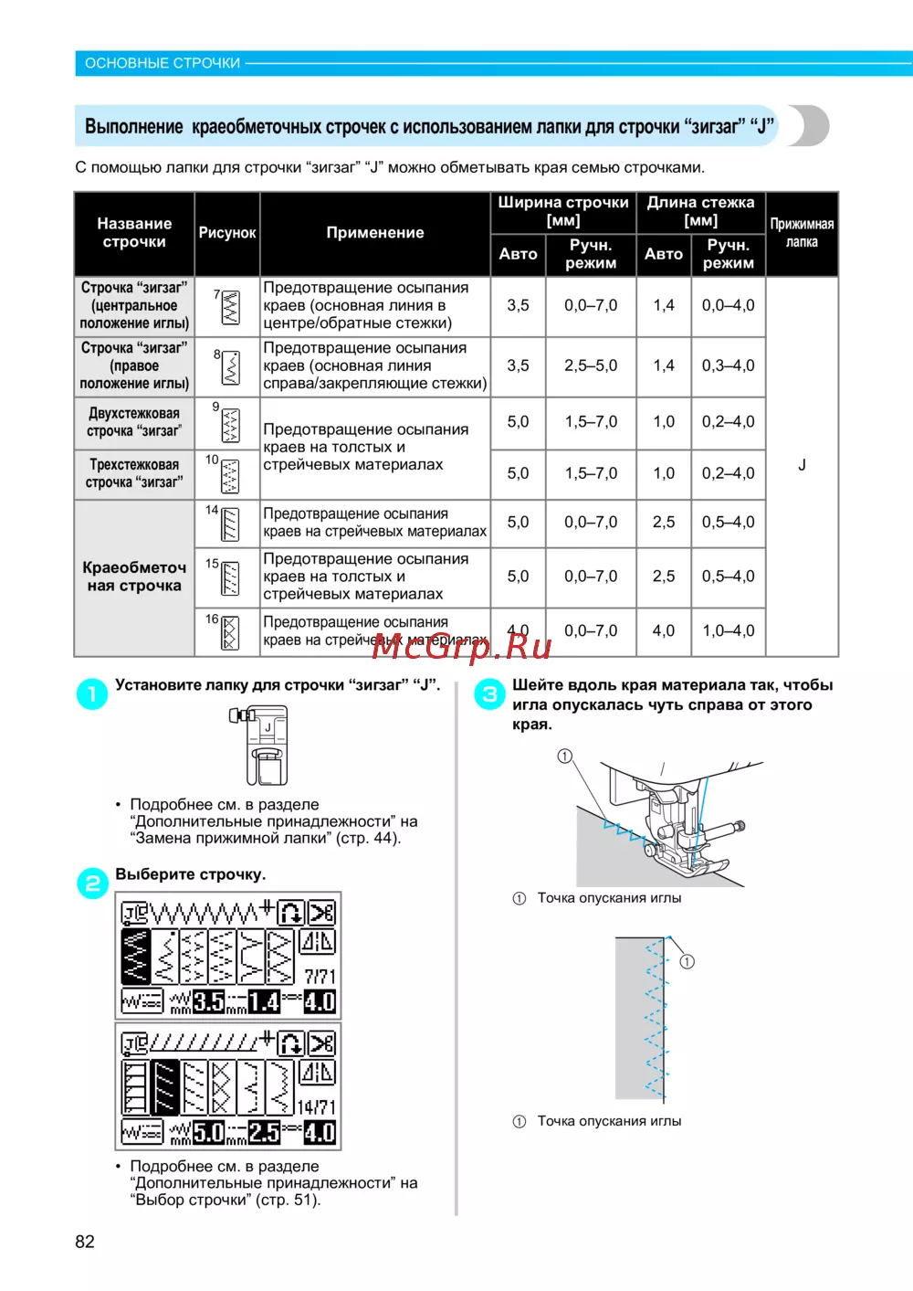 Выполнение краеобметочных строчек с использованием лапки для строчки “зигзаг” “J”