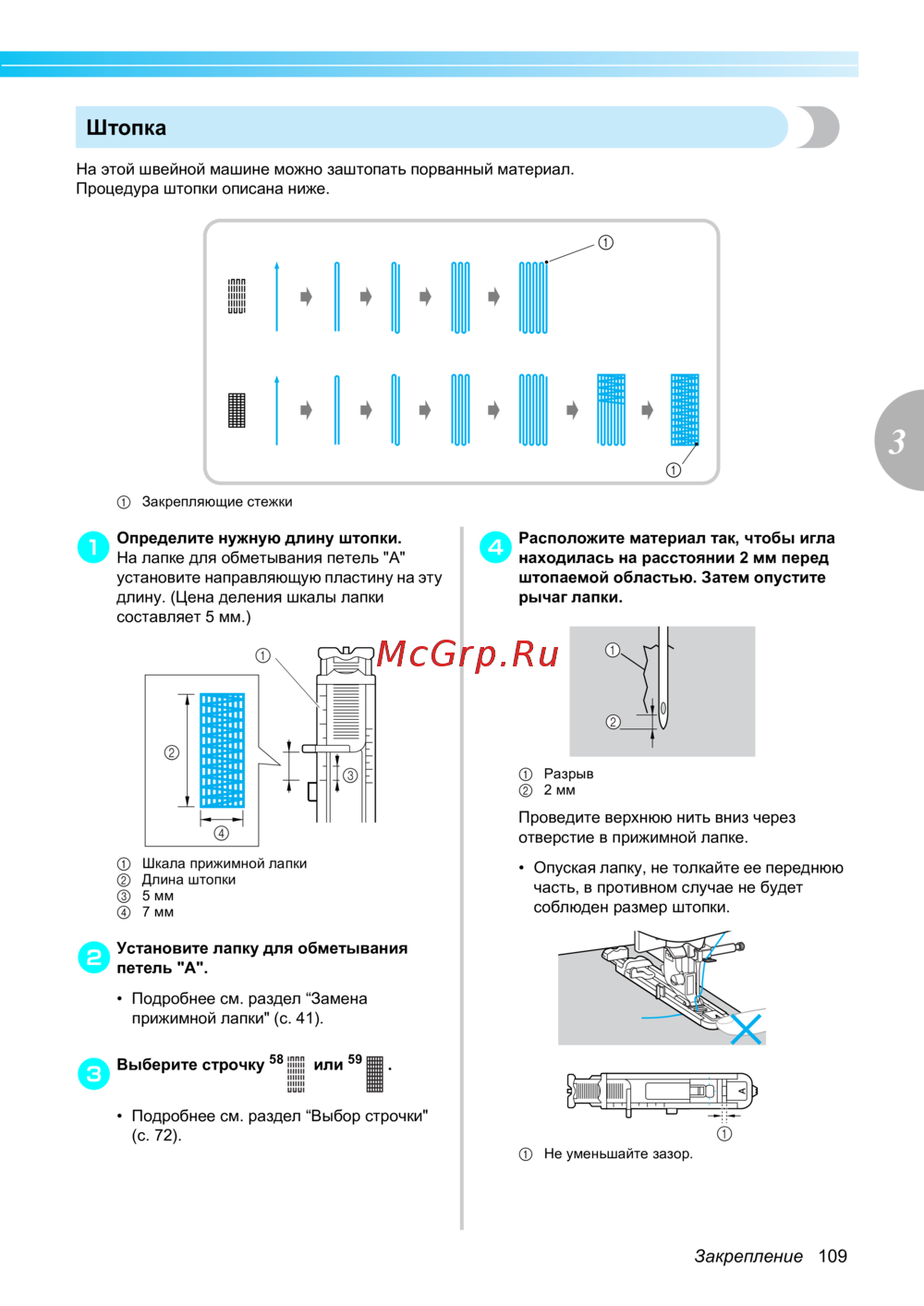 - Убедитесь в правильной установке шпульного колпачка в противном случае возможна поломка иглы p.145