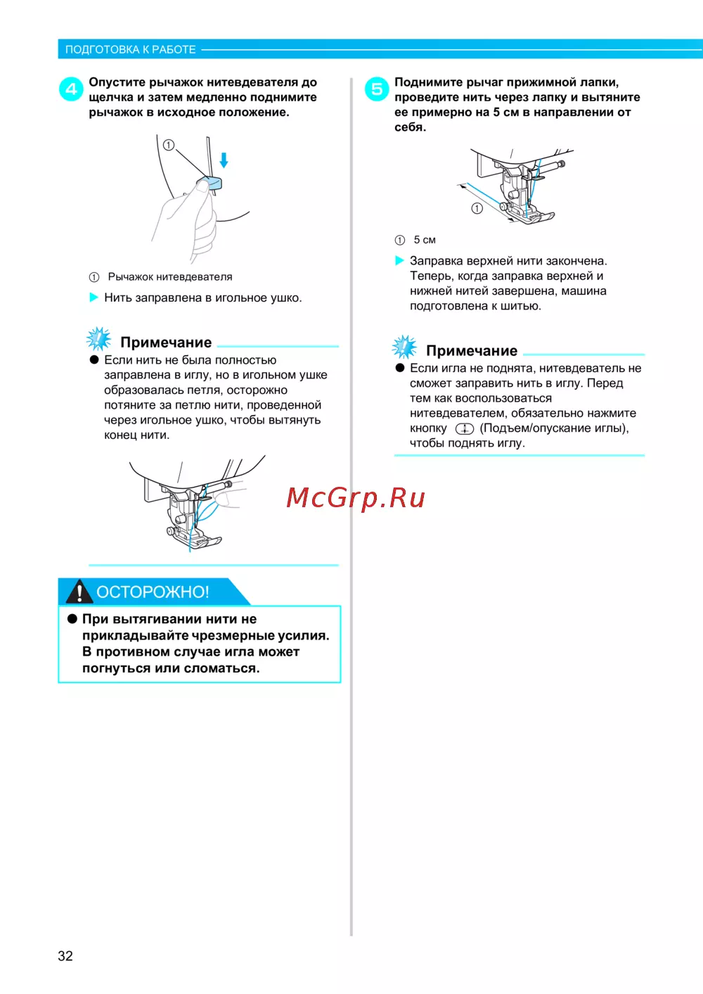 z Если игла не поднята, нитевдеватель не