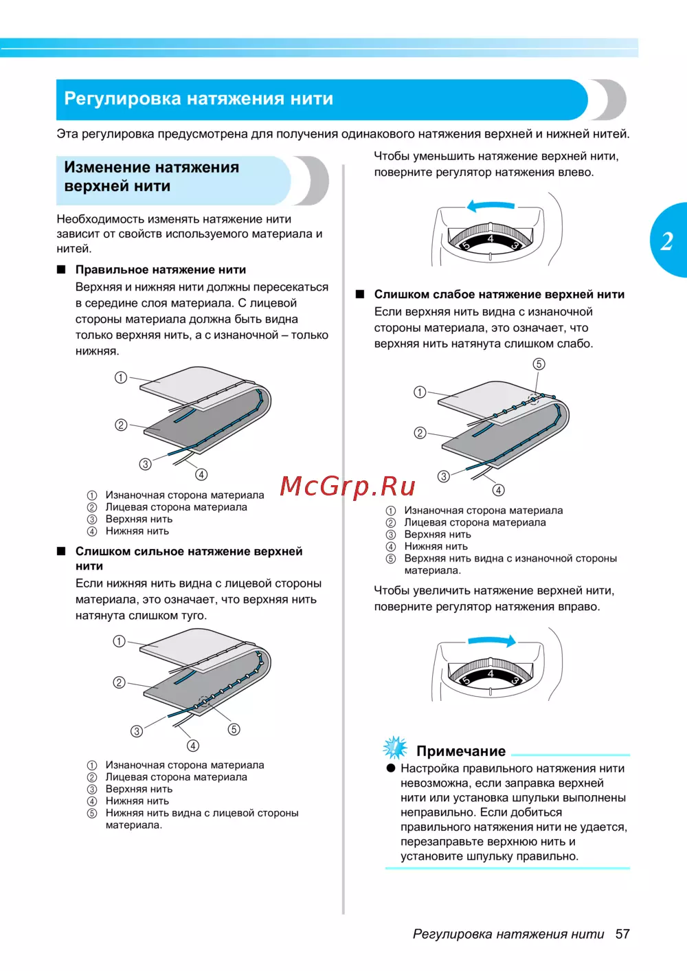 - Убедитесь в правильной установке шпульного колпачка в противном случае возможна поломка иглы p.145