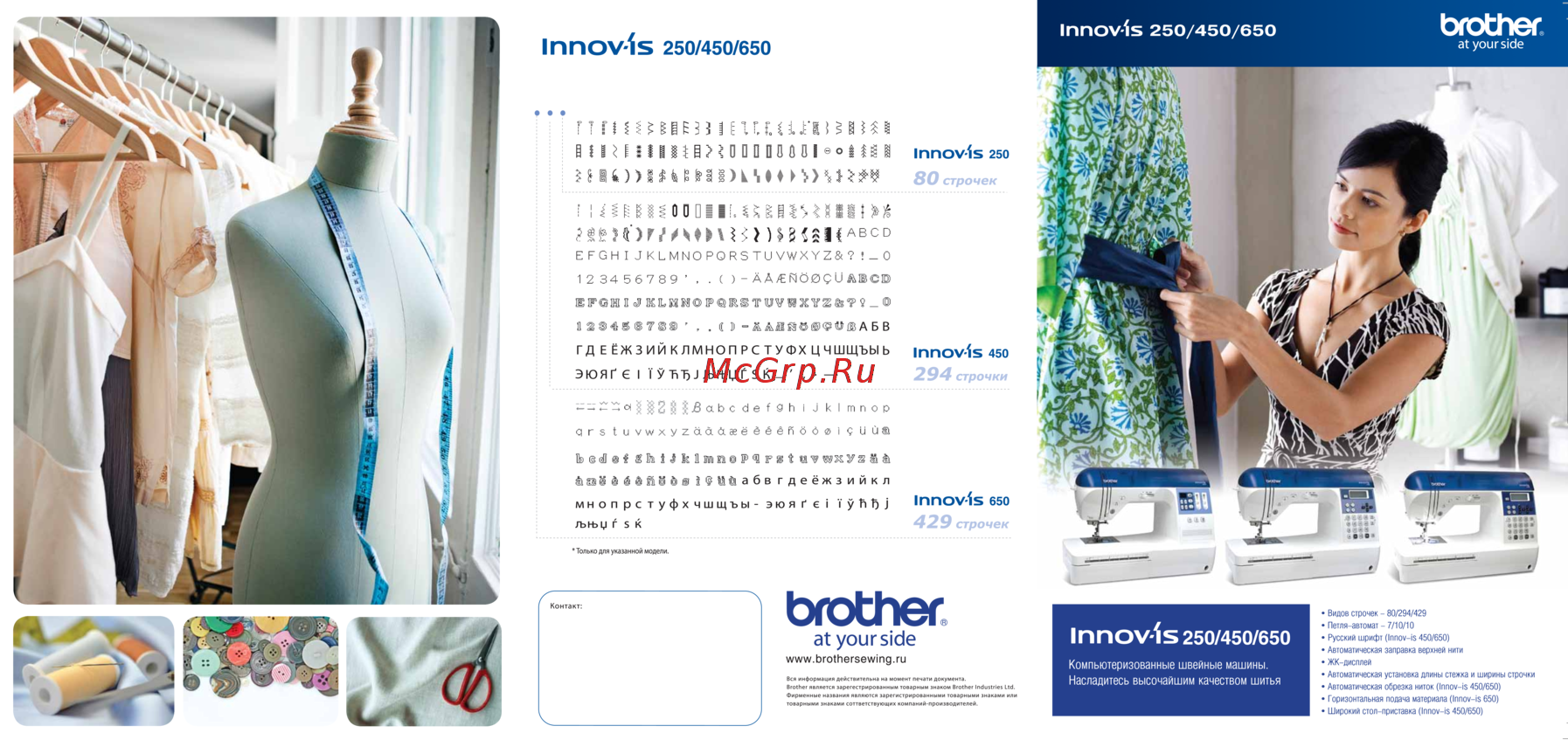 InnOV ls 250 450 650 InnOV ls 250 80 строчек EFGH I JKLMNOPQRSTUVWXYZ _ 0 123456789 АД Е б0Си ЕСЕ ГД E ЁЖЗ ИЙ КЛМНОП PC ТУФХцчшщъыb Innov is 450 ЭЮЯГ I Т У TiTj J ГЫ blJ Г S К _ 294 строчки de f 9 h I J k I mnop q r s t uvwxyzaa aeeeeenoo i q U Cl lb M НО Го И M а бв гдеёжзийкл мн о п р с т у ф х чшщъы эюя Г i Т у Fi Г j InnOV is 650 429 строчек ГЫ Ь Ц Г S к Только для указанной модели at your side www brothersewing ru Вся информация действительна на момент печати документа Brother является зарегестрированным товарным знаком Brother Industries Ltd Фирменные названия являются зарегистрированными товарными знаками или товарными знаками соттветствующих компаний производителей Innov is 250 450 650 Компьютеризованные швейные машины Насладитесь высочайшим качеством шитья Видов строчек 80 294 429 Петля автомат 7 10 10 Русский шрифт 1ППОУ з 450 650 Автоматическая заправка верхней нити ЖК дисплей Автоматическая установка длины стежка и ширины строчки Автоматическая обрезка ниток 1ППОУ з 450 650 Горизонтальная подача материала 1ППОУ э 650 Широкий стол приставка 1ППОУ З 450 650
