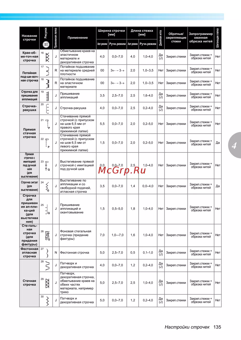 - В следующей таблице для основных строчек приводятся варианты применения длина стежка и ширина строчки а также возможность использования двойной иглы p.136