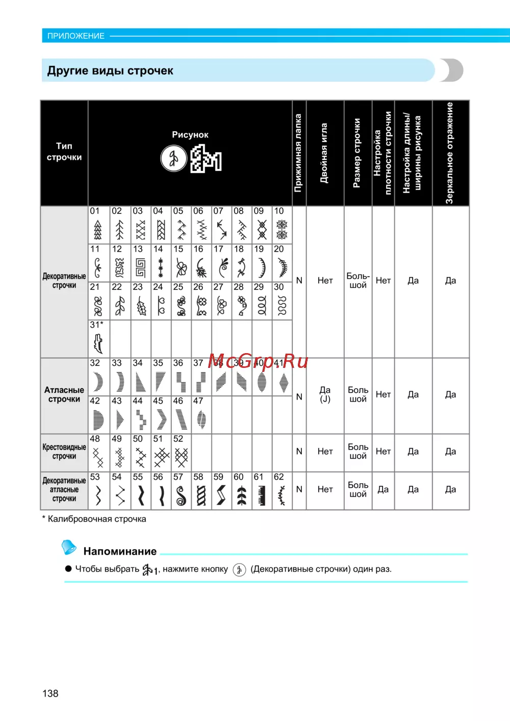 - В следующей таблице для основных строчек приводятся варианты применения длина стежка и ширина строчки а также возможность использования двойной иглы p.136