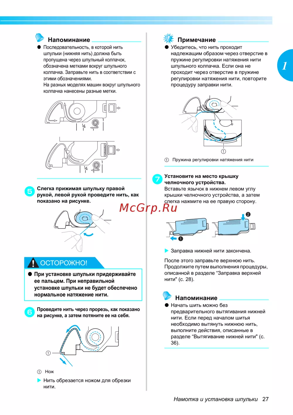- Убедитесь в правильной установке шпульного колпачка в противном случае возможна поломка иглы p.145