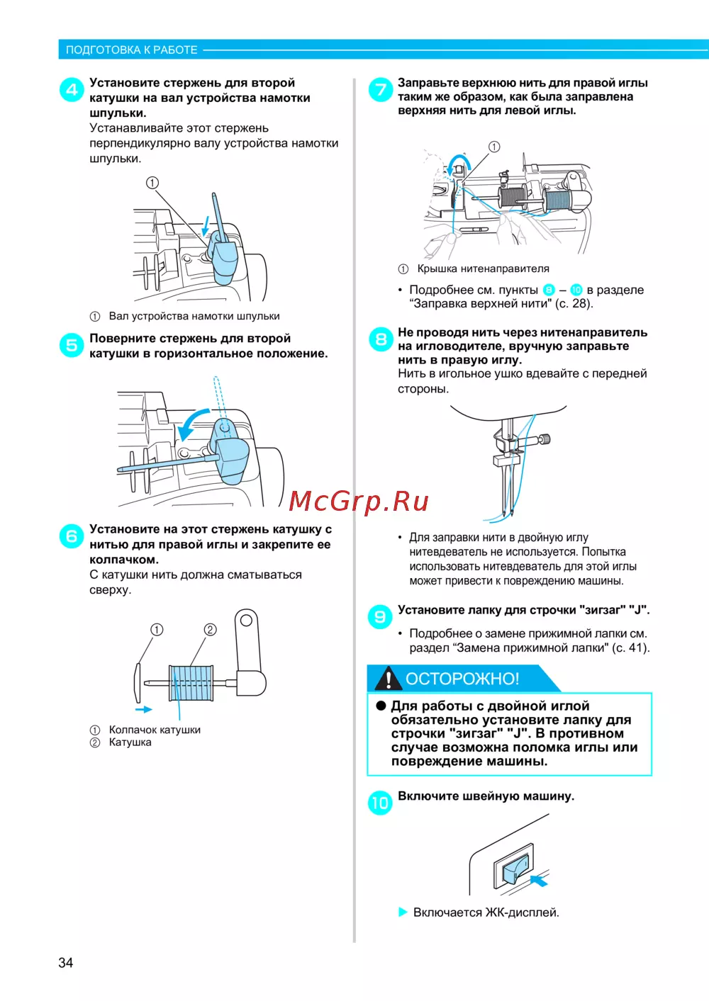 - Убедитесь в правильной установке шпульного колпачка в противном случае возможна поломка иглы p.145