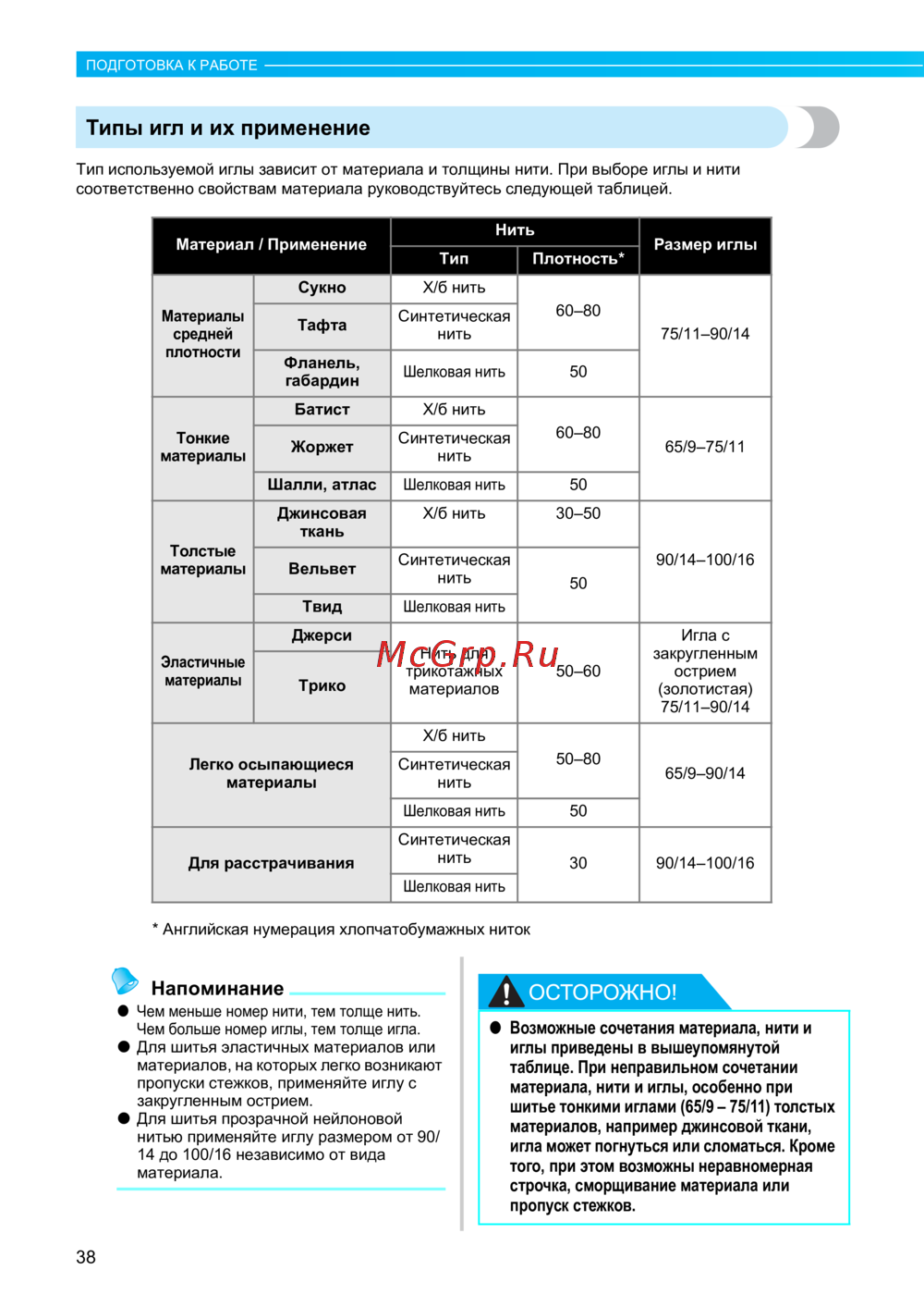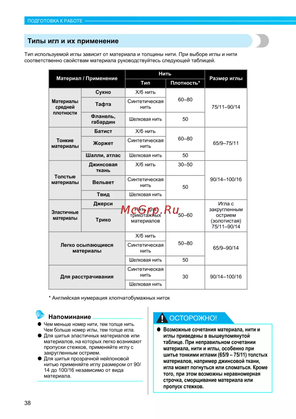 Brother INNOV-'IS NV-350 SE (SPECIAL EDITION) — выбор игл для шитья: типы и их применение в зависимости от материалов [40/168]