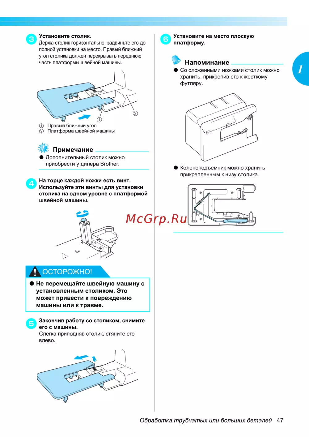 Узнайте, как правильно установить столик для швейной машины, чтобы обеспечить удобство работы с трубчатыми и большими деталями. Следуйте простым шагам для безопасной эксплуатации.