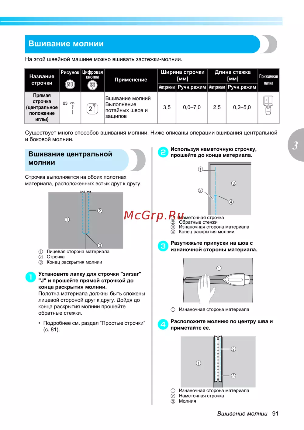Существует много способов вшивания молнии. Ниже описаны операции вшивания центральной
