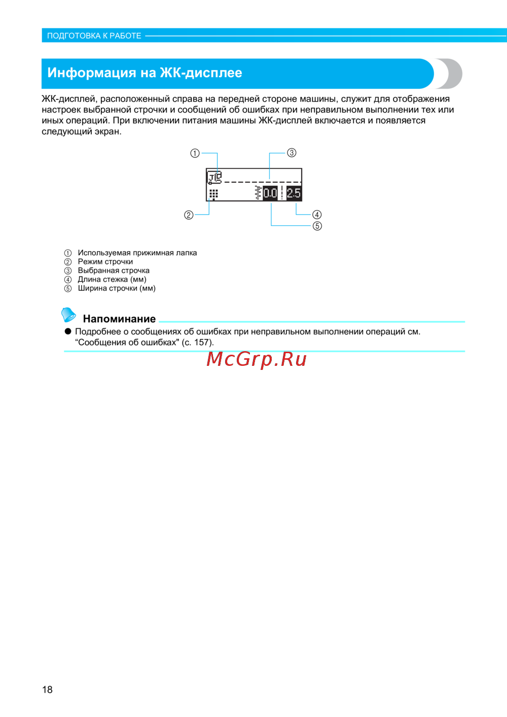 - На панели управления расположенной справа на передней стороне машины находятся жк дисплей жидкокристаллический дисплей и кнопки для настройки и выбора различных швейных операций p.15