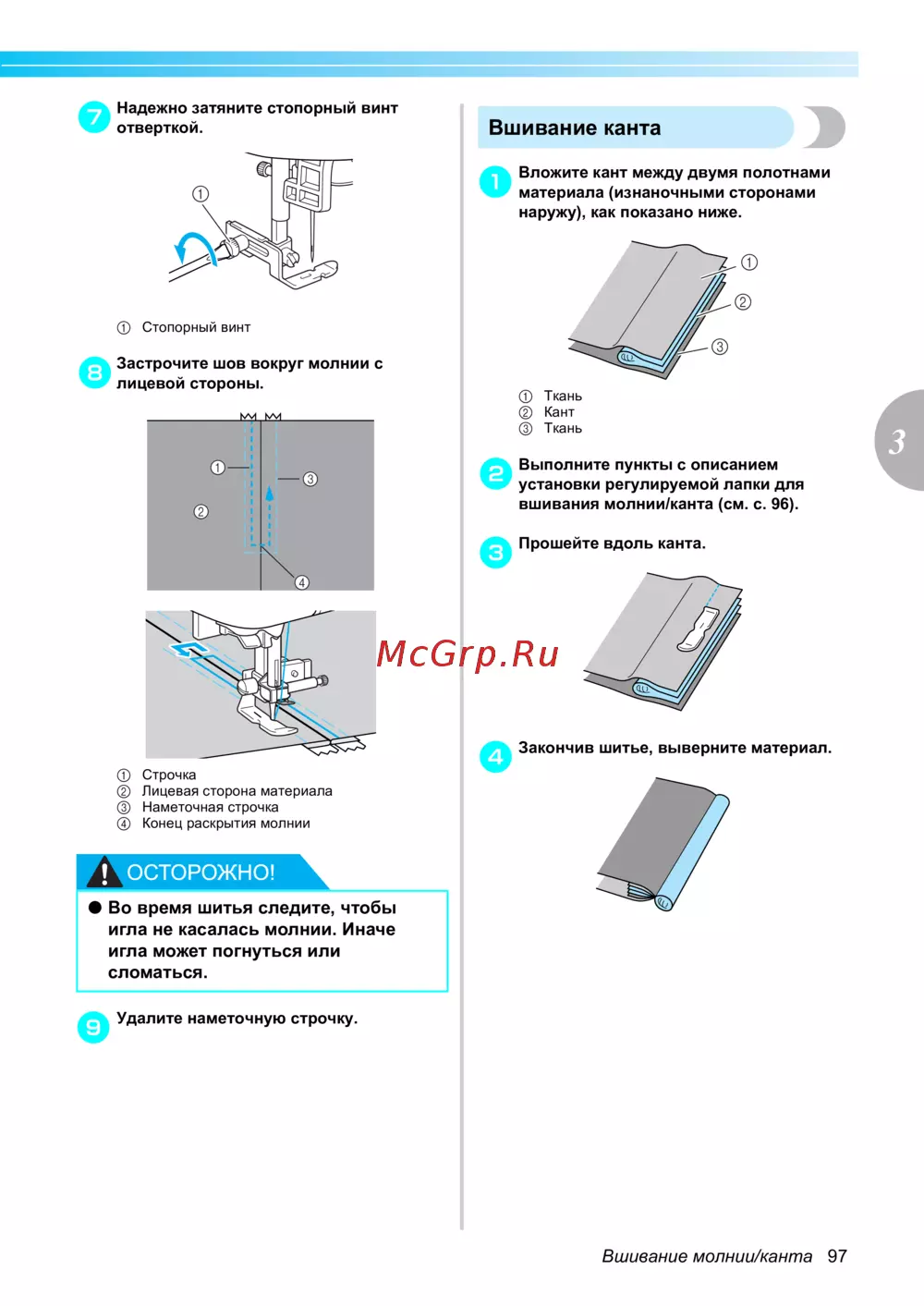 Brother INNOV-IS NV-V5 — инструкция по вшиванию молнии и канта в текстильные изделия [99/168]