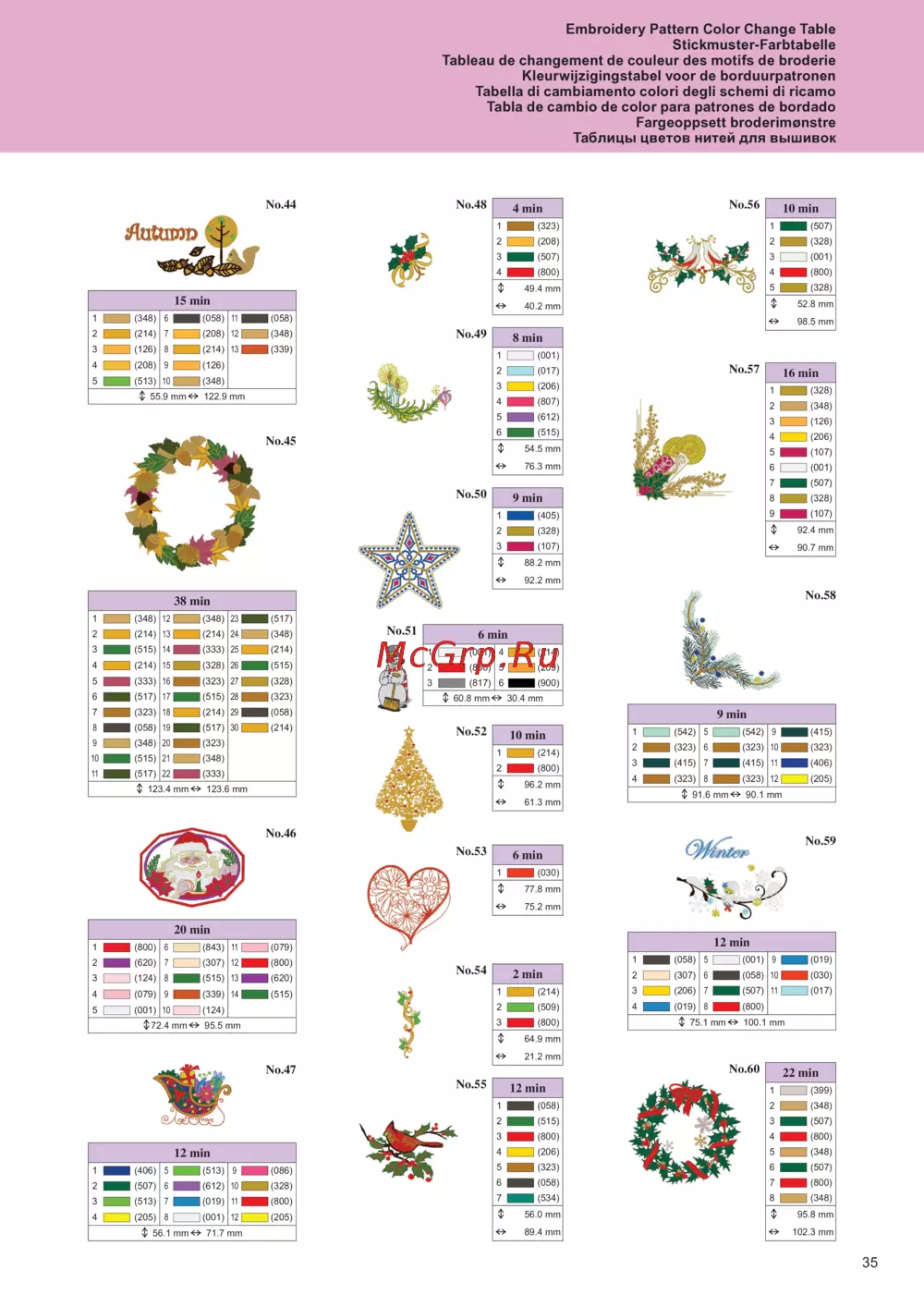 - Embroidery pattern color change table stickmuster farbtabelle tableau de changement de couleur des motifs de broderie kleurwijzigingstabel voor de borduurpatronen tabella di cambiamento colori degli schemi di ricamo tabla de cambio de color para patrones de bordado fargeoppsett broderimønstre таблицы цветов нитей для вышивок p.47