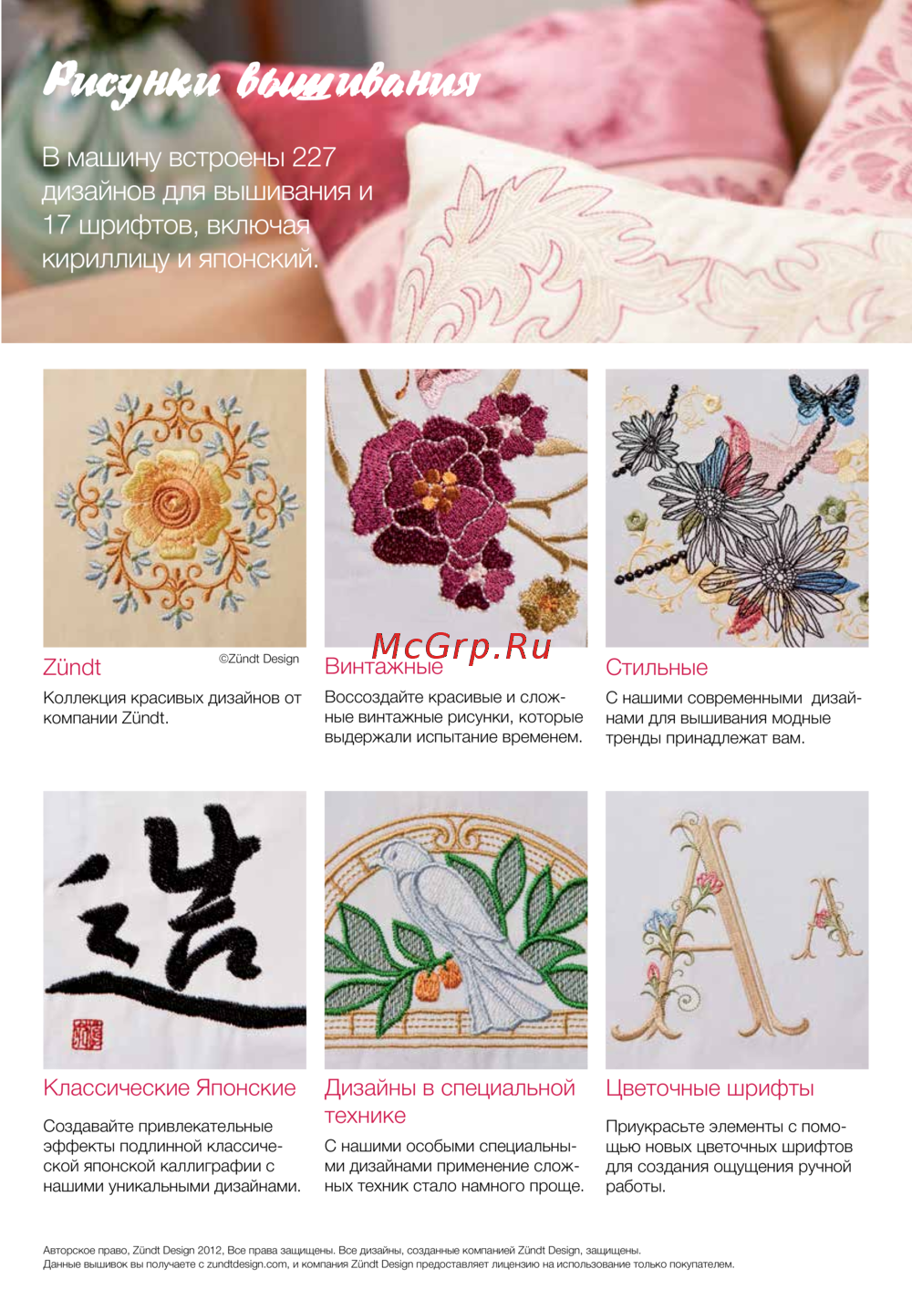- Вмашинувстроены227 дизайновдлявышиванияи 17шрифтов включая кириллицуияпонский p.7