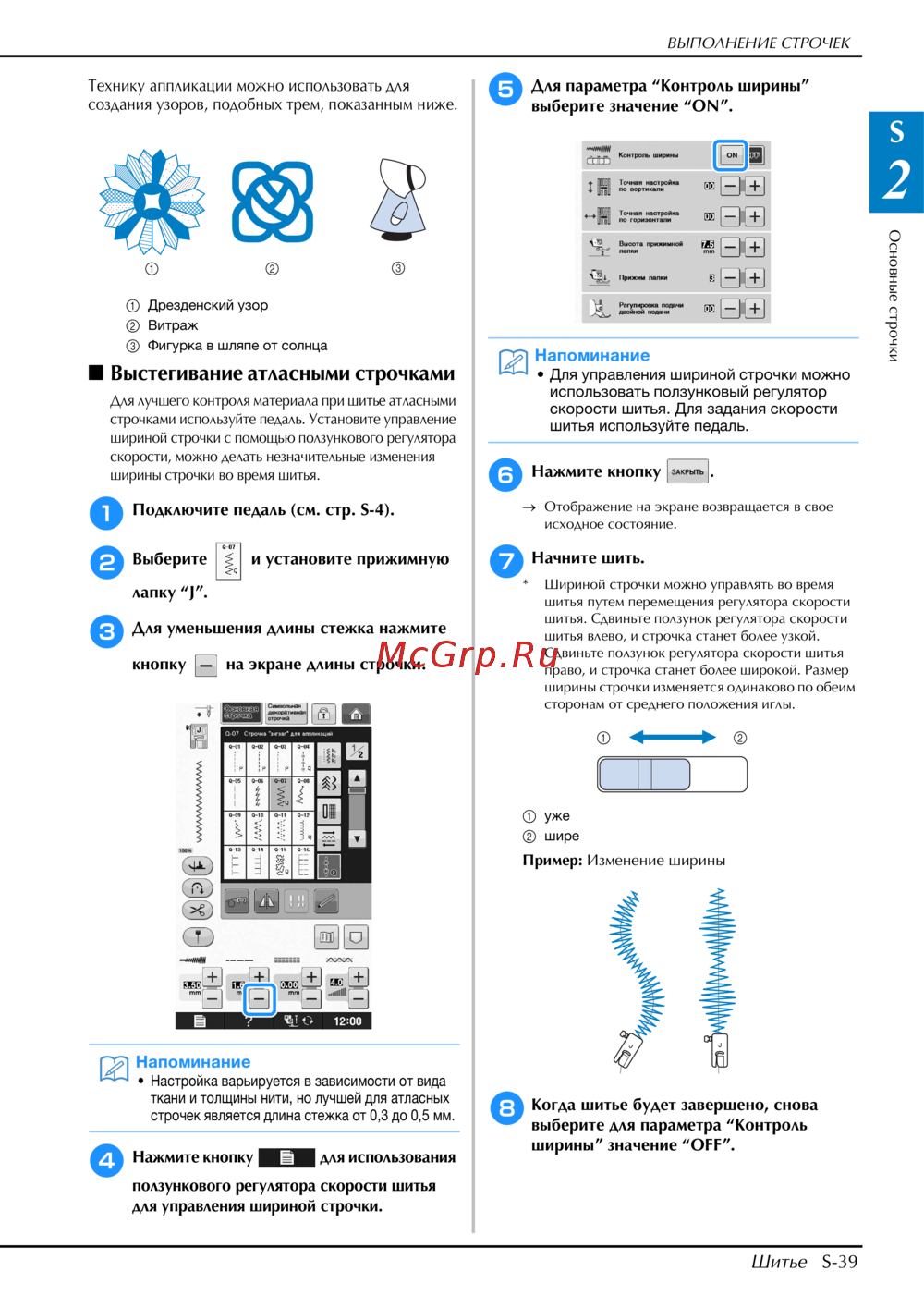 Изучите технику шитья с управлением шириной строчки и аппликацией. Узнайте, как добиться идеальных узоров и настроить параметры для различных тканей.