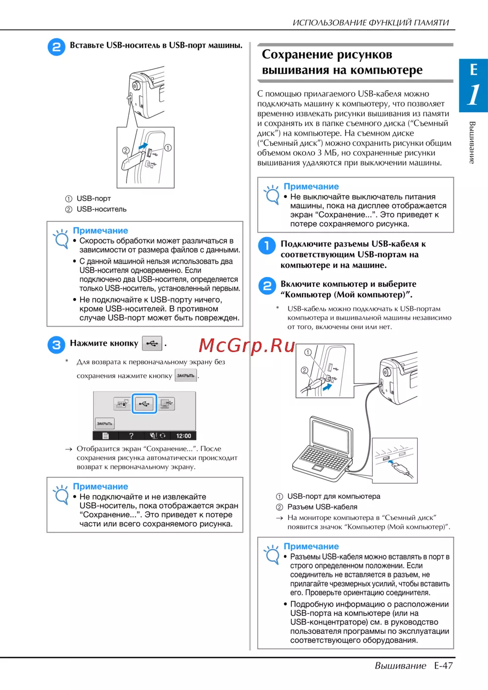 Узнайте, как подключить USB-носитель к вышивальной машине и сохранить рисунки. Следуйте простым шагам для безопасного использования функций памяти.