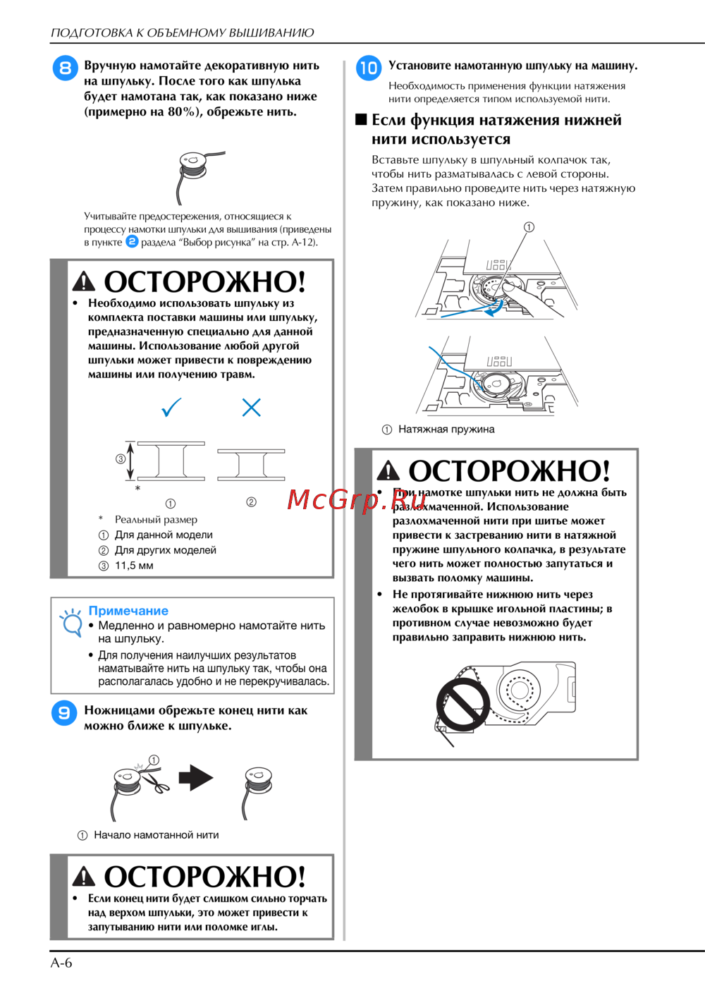 - Вытащите запутавшуюся нить если она не вытаскивается обрежьте нить ножницами p.310