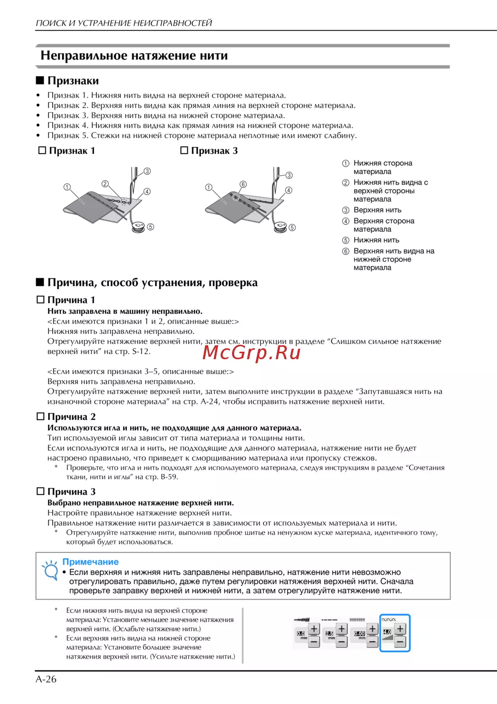 изнаночной стороне материала” на стр. A-24, чтобы исправить натяжение верхней нити.