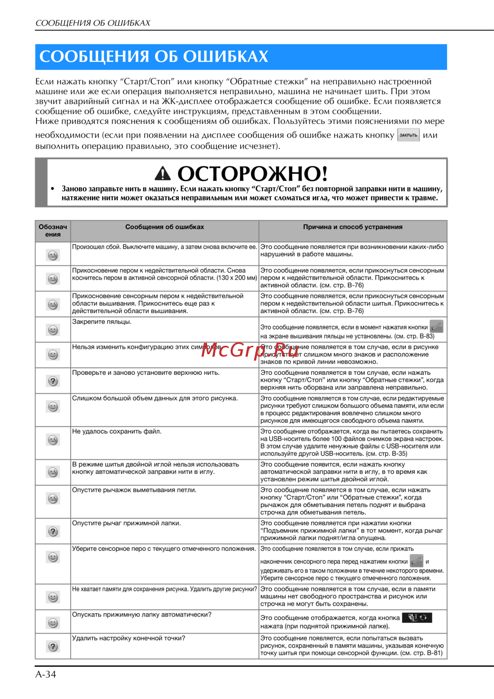 - Если нажать кнопку старт стоп или кнопку обратные стежки на неправильно настроенной машине или же если операция выполняется неправильно машина не начинает шить при этом звучит аварийный сигнал и на жк дисплее отображается сообщение об ошибке если появляется сообщение об ошибке следуйте инструкциям представленным в этом сообщении ниже приводятся пояснения к сообщениям об ошибках пользуйтесь этими пояснениями по мере p.320
